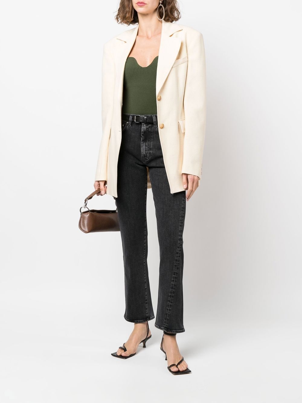 Black cotton blend twisted-seam straight-leg jeans from TOTEME featuring straight leg, logo patch to the rear, high waist, belt loops, front button and zip fastening, classic five pockets and cropped. Conscious: We've partnered with Good On You – an ethical agency that rates how sustainably brands perform. This item comes from a brand that performs well in relation to their impact on people, which ensures good working conditions in the supply chain..