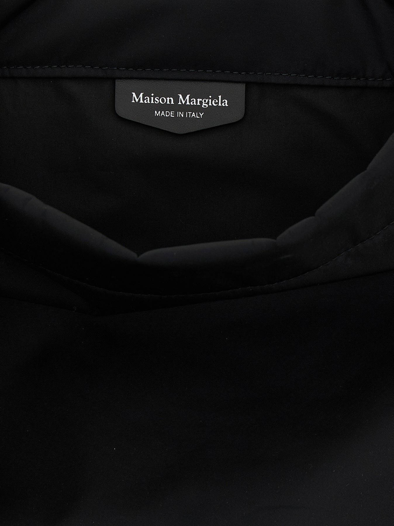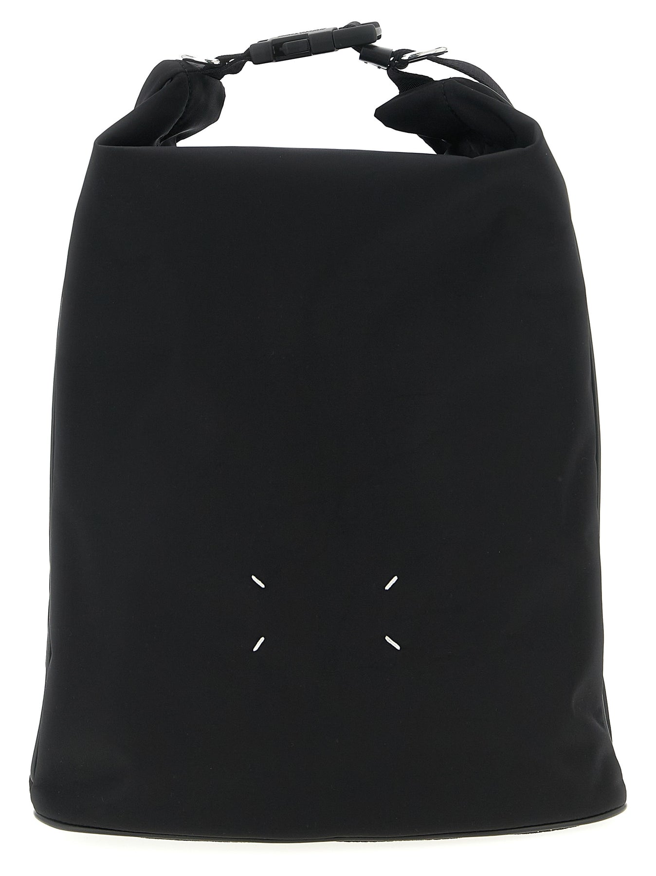 Structured tech fabric backpack with leather details, padded mesh base, roll-up closure with 'Numeric signature MM6' tuc, name pocket with embossed logo, adjustable and removable ribbon shoulder straps, 'Four stitches' at the back.