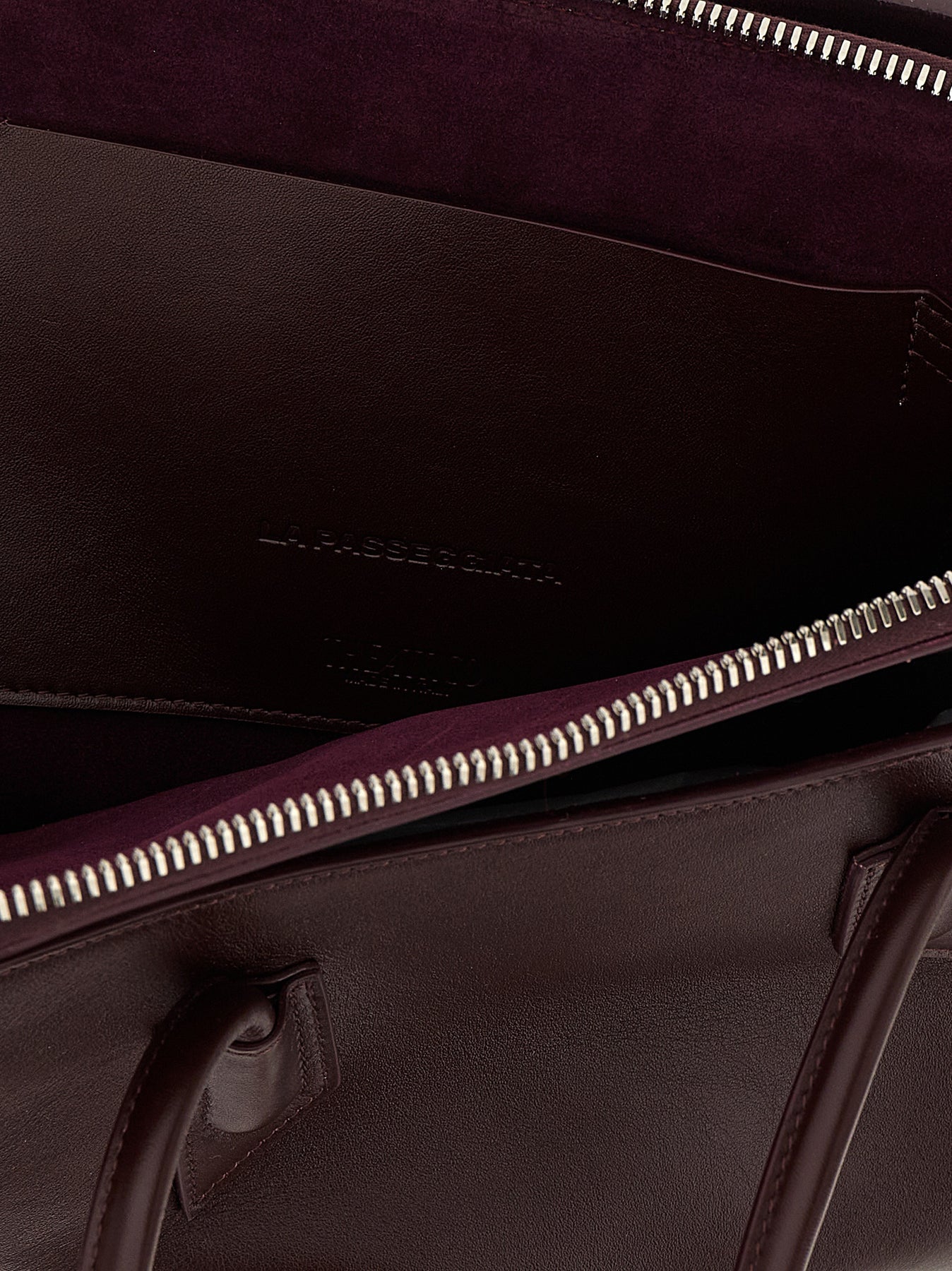 'La Passeggiata Medium' shoulder bag in calfskin leather, embossed logo on the front, double fixed tubular handles, top zip closure, side pockets, rigid base with metal logo feet.