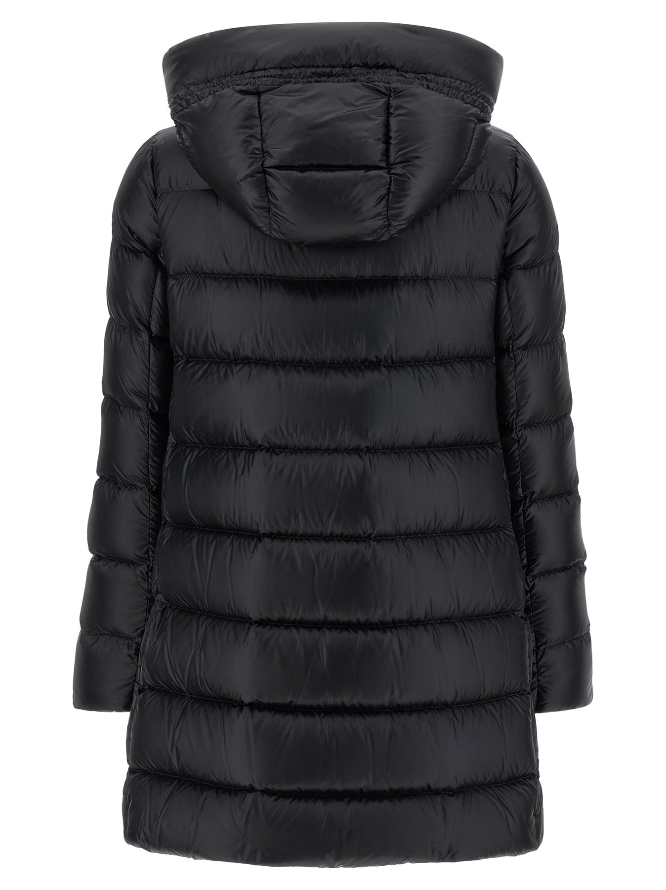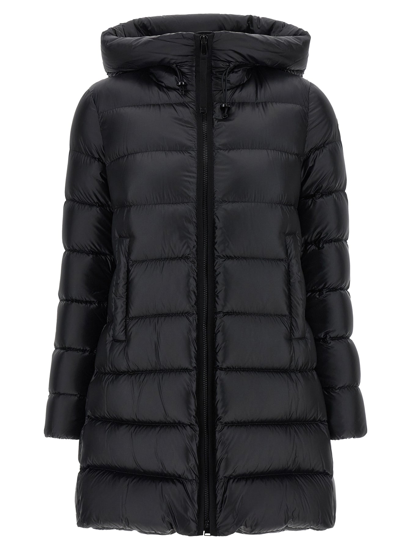 'Suyenne' midi down jacket in boudin quilted nylon with goose down padding, flared silhouette, adjustable hood, front zip closure, pockets, long sleeves with elastic cuffs and felt logo patch appliqué, SUSTAINABLE: Product made with recycled materials.