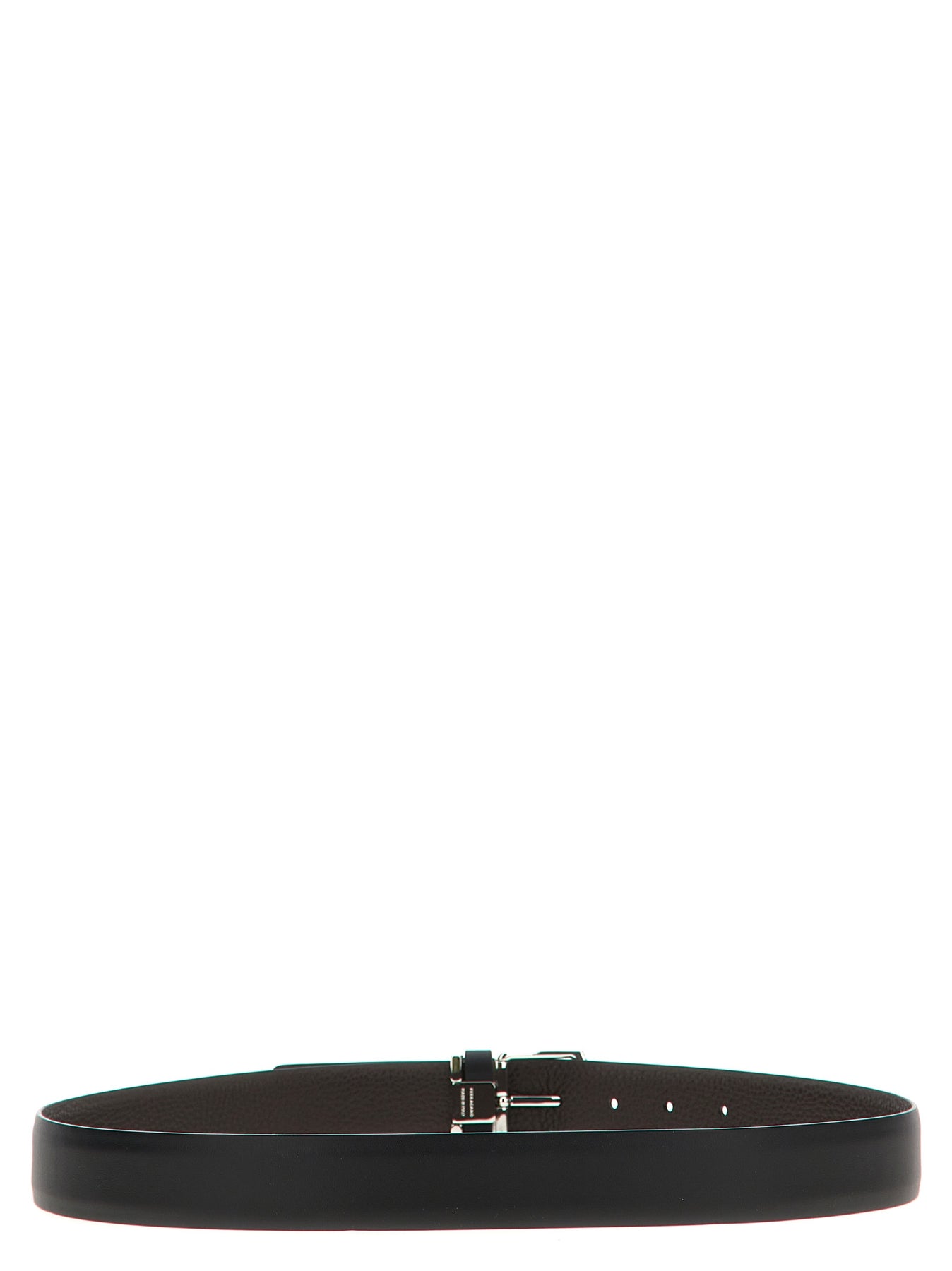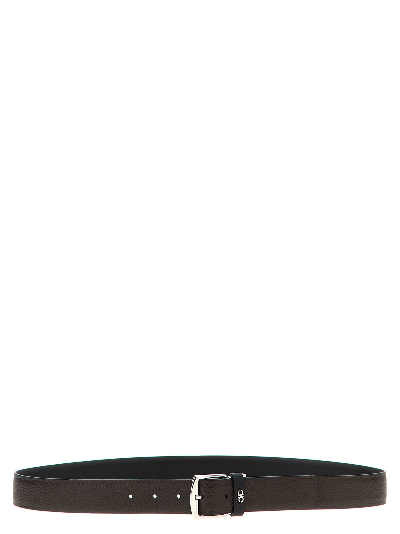 Reversible belt in hammered brown and smooth black leather with hook hardware closure.