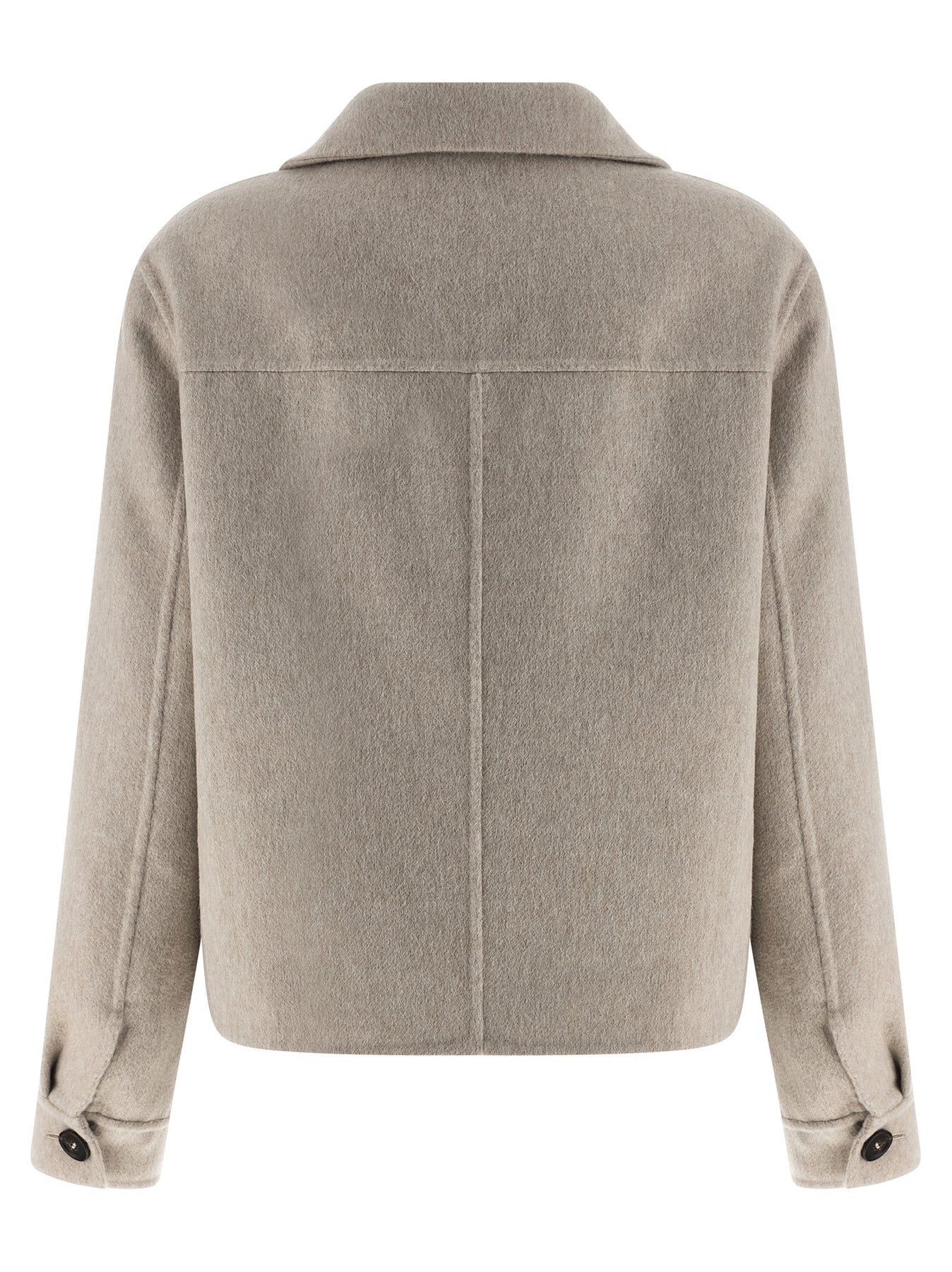 Cashmere short coat, unlined, double-breasted with front button closure, shirt collar, pockets, long sleeves with cuffs.