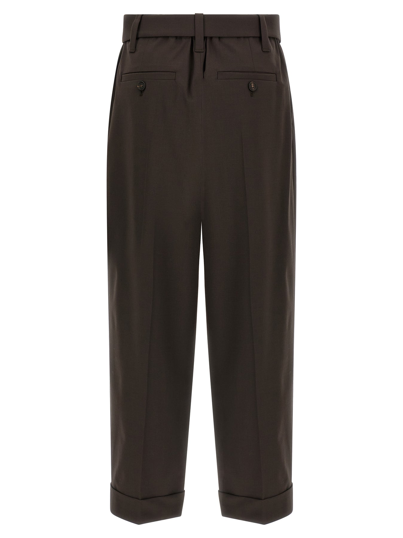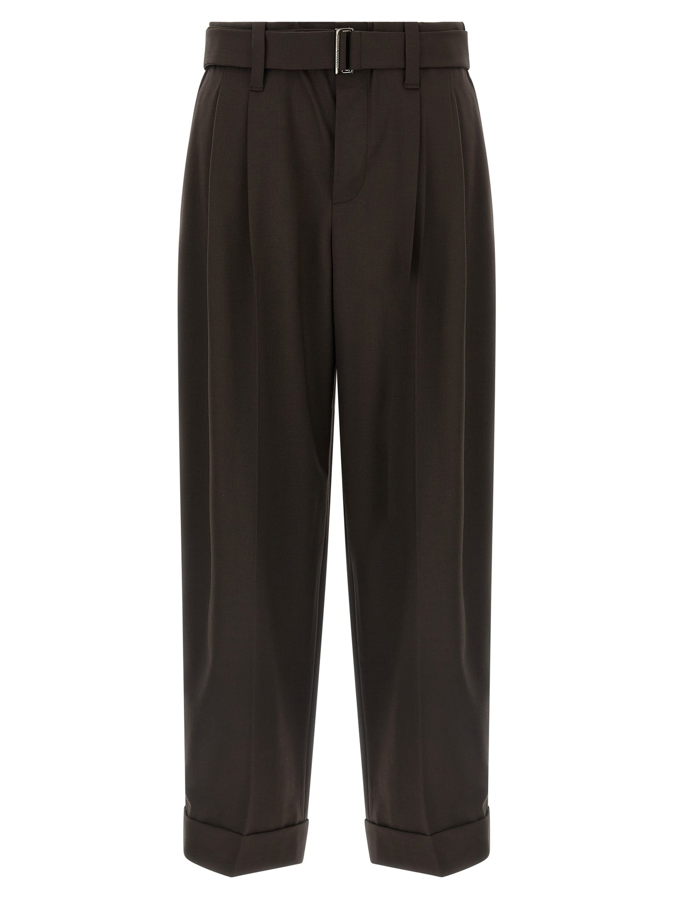 Baggy wool pants with front stretched pleat, adjustable waist belt with logo metal buckle, stitched turn-up on the hem, pockets.
