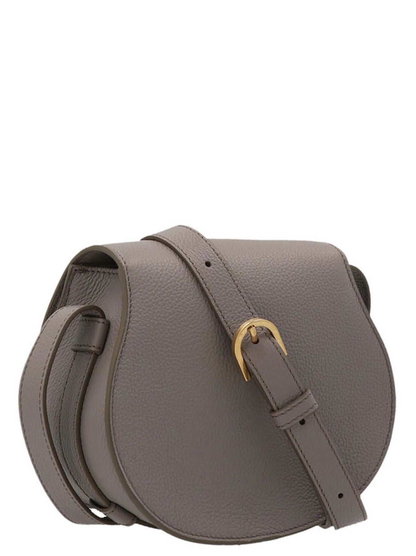 Small 'Saddle marcie' suede crossbody bag with quince stitching, magnetic button closure and adjustable shoulder strap.