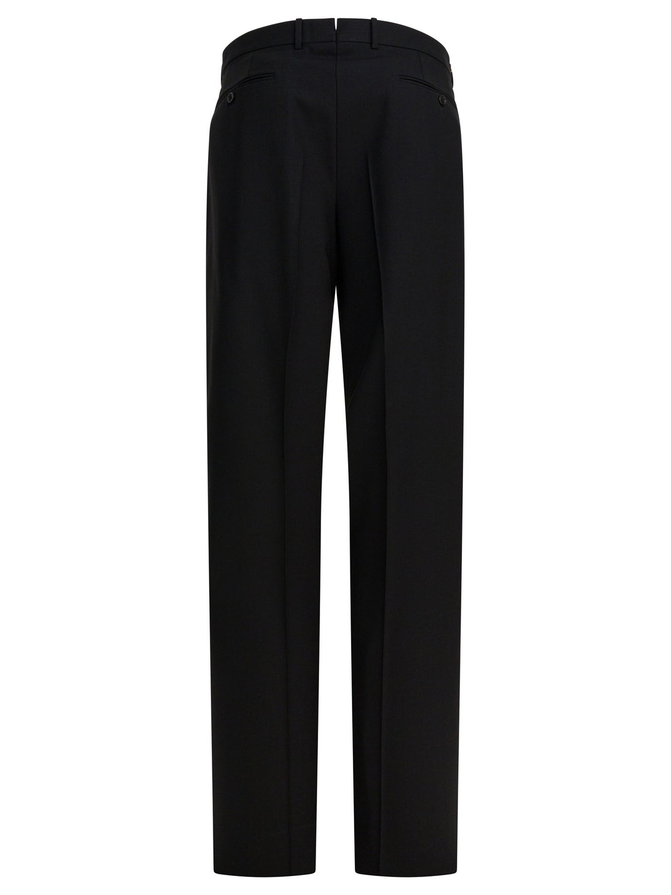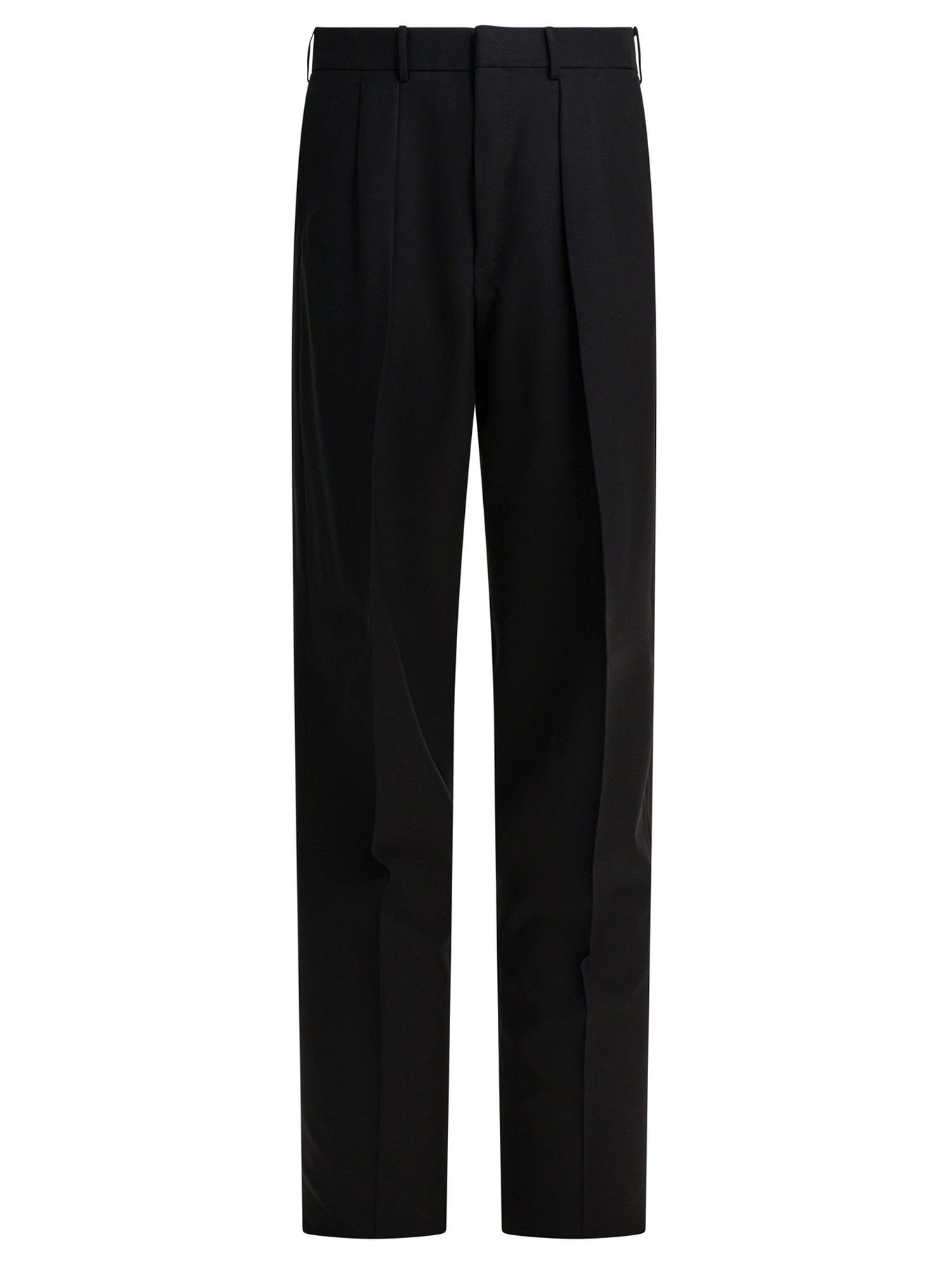 Tom Ford "Broken" pants with double pleat front construction and regular line construction. The silhouette features moderate volume with integrated belt loops at the waist and front closure consisting of a button and zipper. Side welt pockets are accompanied by back welt pockets with button closure. Material selection favors the predominant presence of wool and compact workmanship. || - Double front pleats - Belt loops - Button and zipper closure - Side welt pockets - Back welt pockets with button