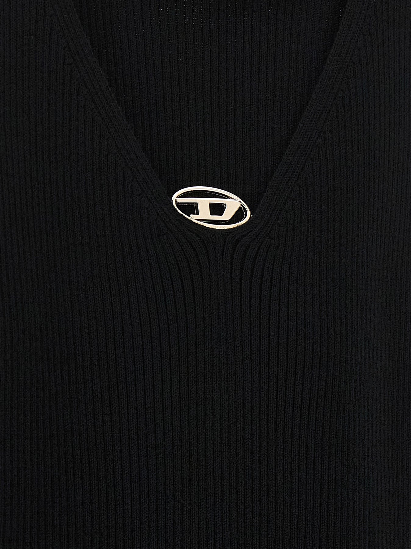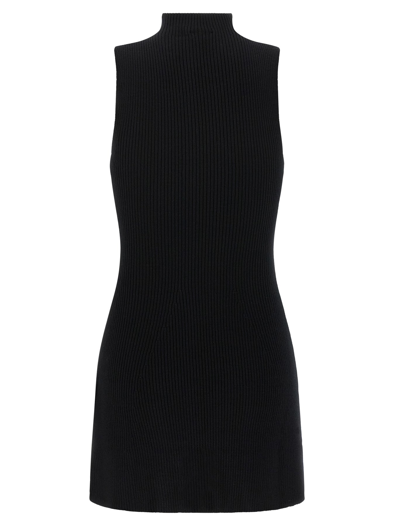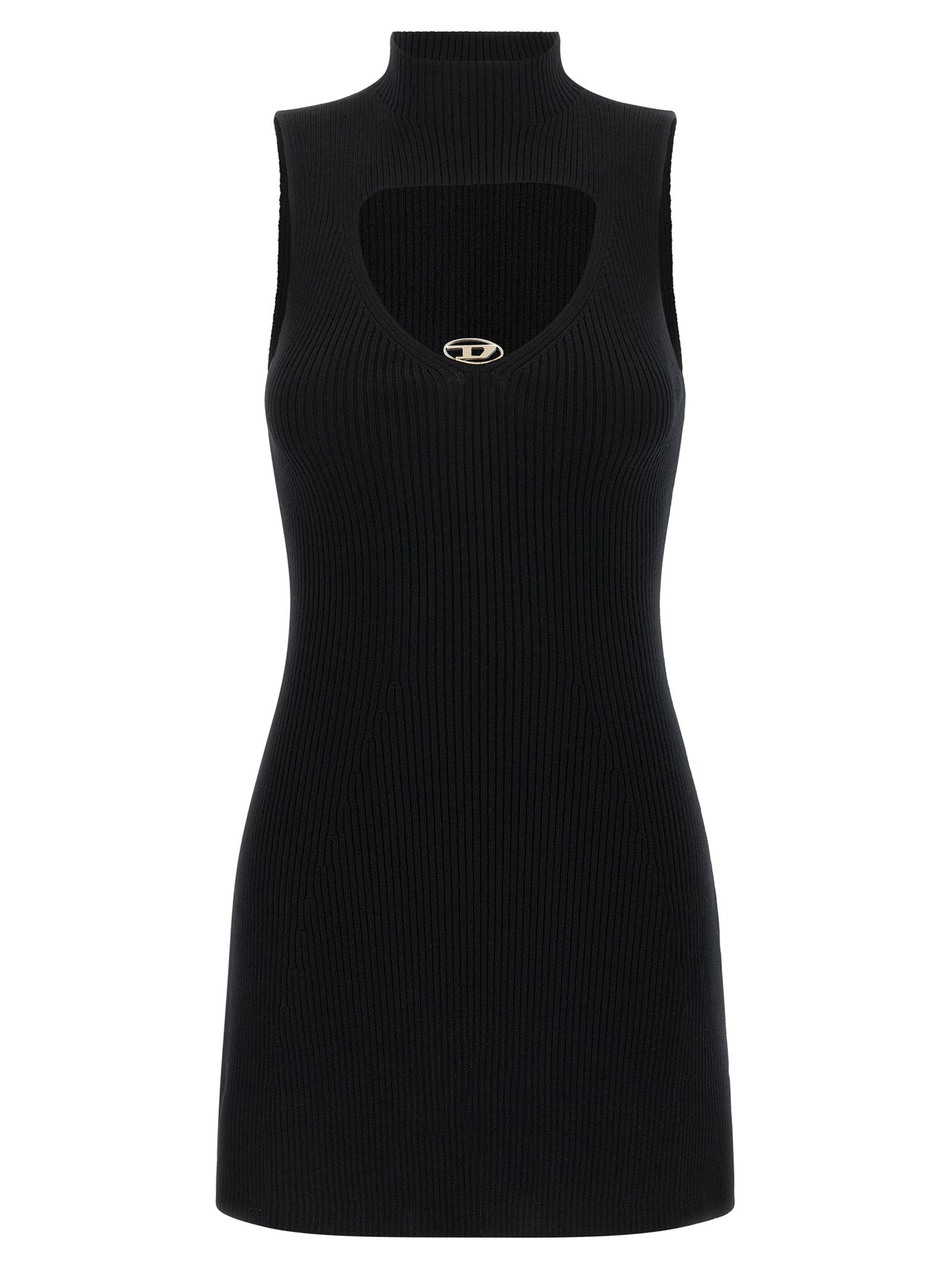 'M-Oloni short' dress in ribbed knit wool, crew neck, front cut-out detail with metal Oval-D application, sleeveless.