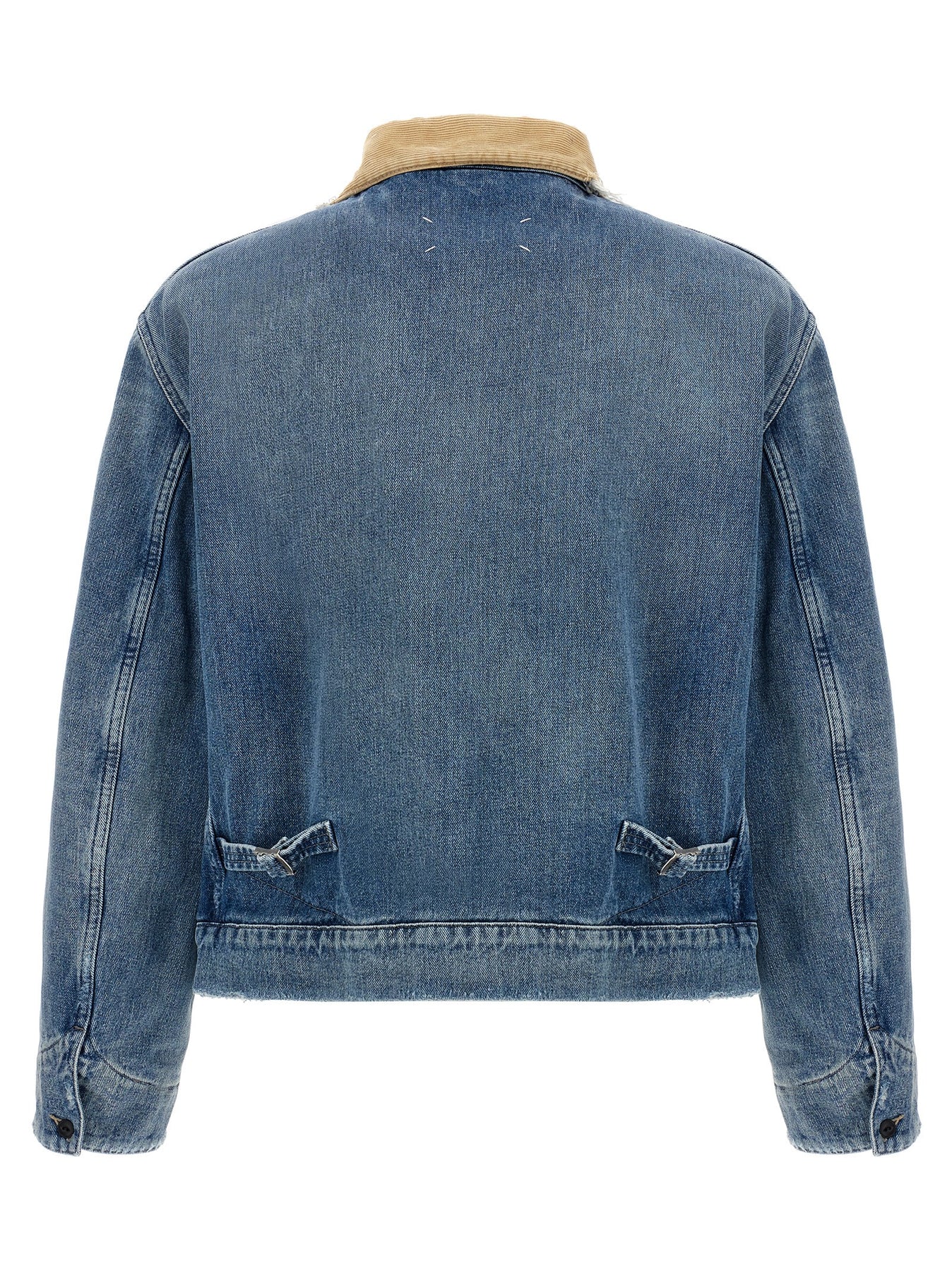 Stonewashed cotton denim jacket with used-effect corduroy collar, front zip closure, pockets, long sleeves, and four stitches at the back.