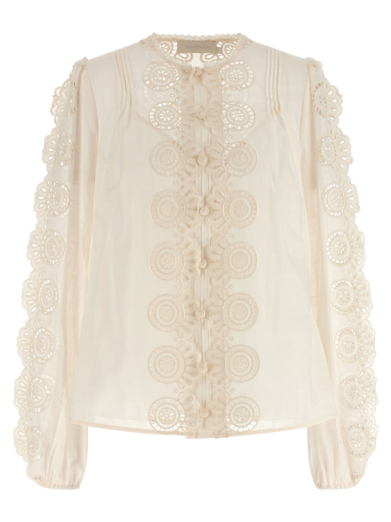 Cotton blouse, crew neck, front button closure, long sleeves with elastic on the bottom, lace on the sleeves and cut-out details.