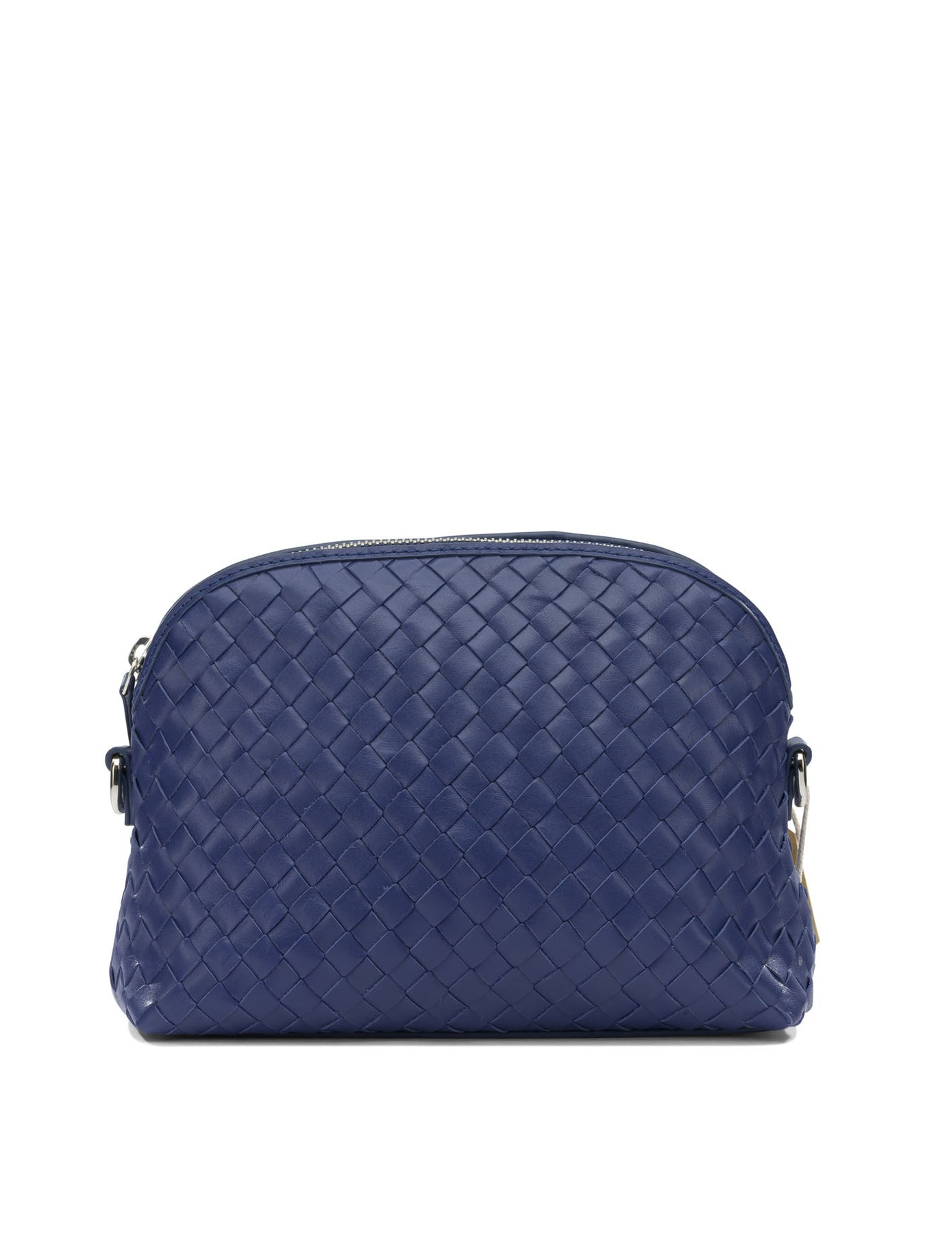 Dragon Diffusion small "Fellini" clutch bag, made of woven Italian cowhide leather. Compact structure, essential line, semi-rigid construction. Top closure with metal zipper. Interior finished with cotton drill lining, fitted with flat patch pockets. Minimalist silhouette is complemented by a detachable leather shoulder strap designed for versatile, hands-free use. || - Woven Italian cowhide leather - Cotton drill lining with pockets - Zipper top closure - Removable leather shoulder strap - Interior pendant with hand-sewn antiqued medal of St. Christopher - Structured and compact silhouette