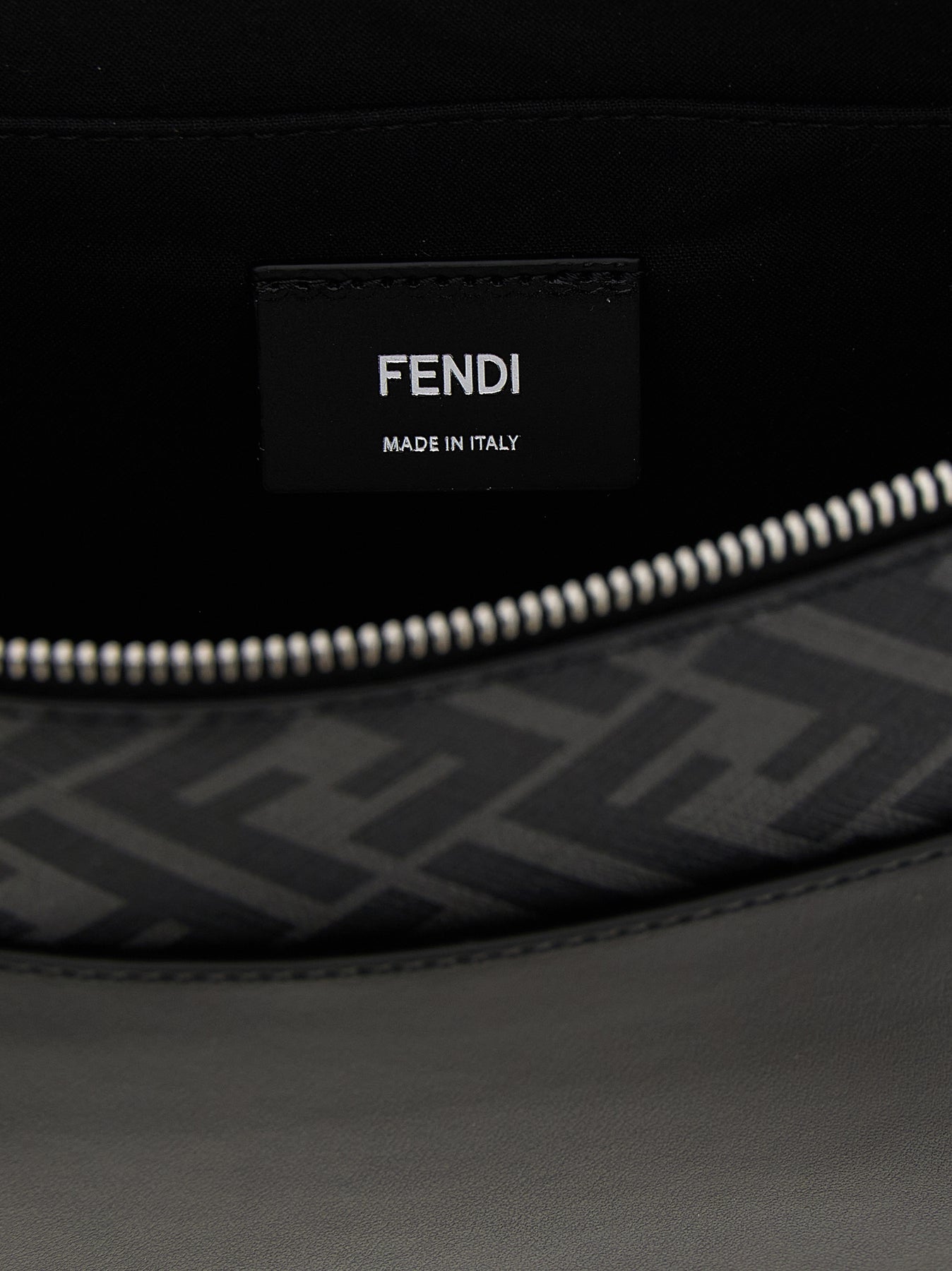 'Squared FF' smooth leather and FF canvas clutch, front metal logo, top zip closure, removable bracelet handle.