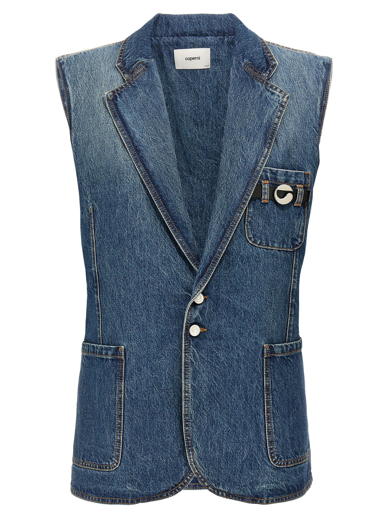 Delavé cotton denim vest, pocket with strap detail with front metal logo, mirror lapels, button closure, pockets, back vent.