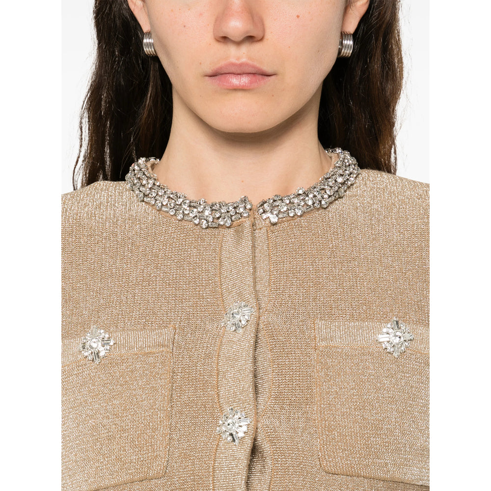 gold-tone embellished neckline ruffled cuffs button fastening peplum hem two chest pockets