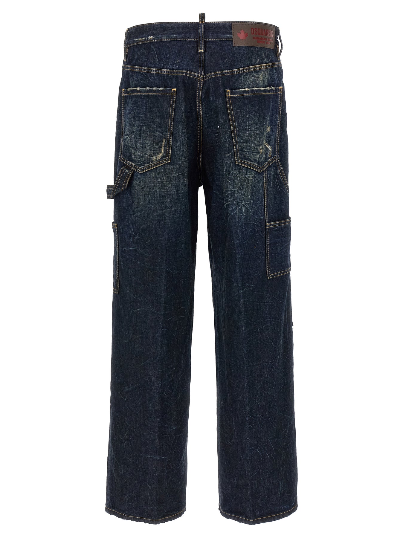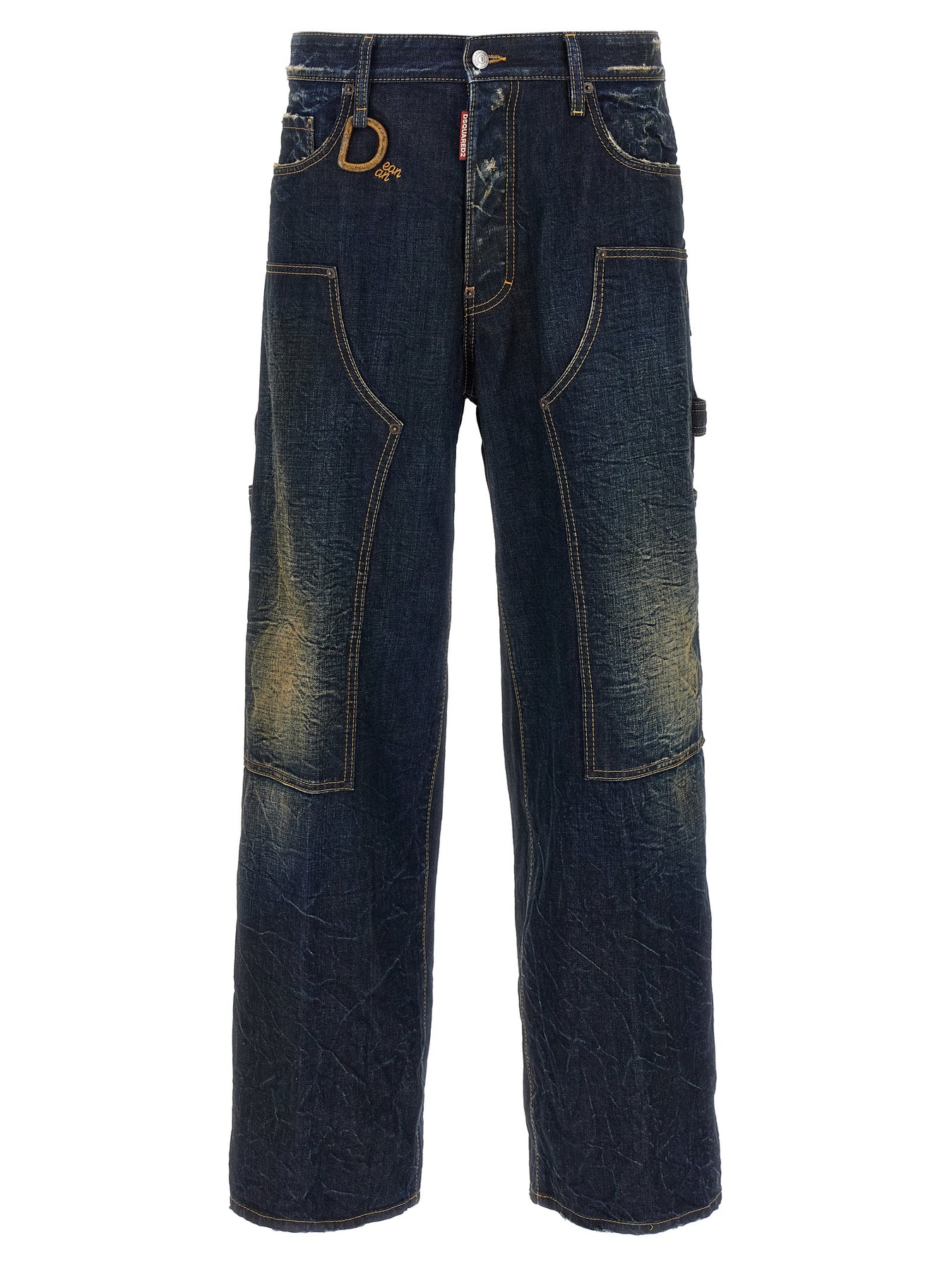 'Loose Carpenter' cotton denim jeans with dusty distressed treatment, contrast stitching, front button closure, vintage-effect metal charm with front logo embroidery, straight leg, back leather logo tag.