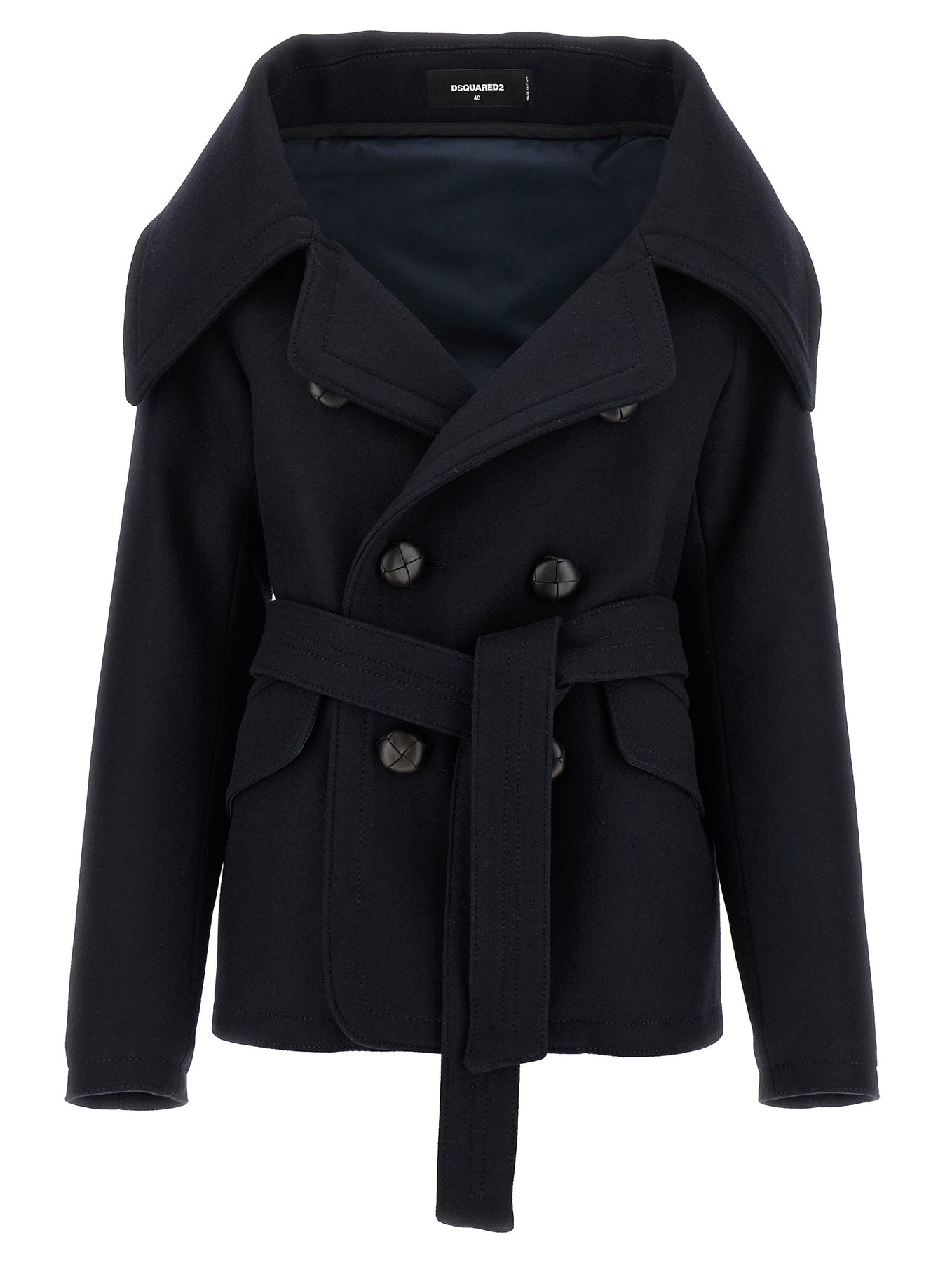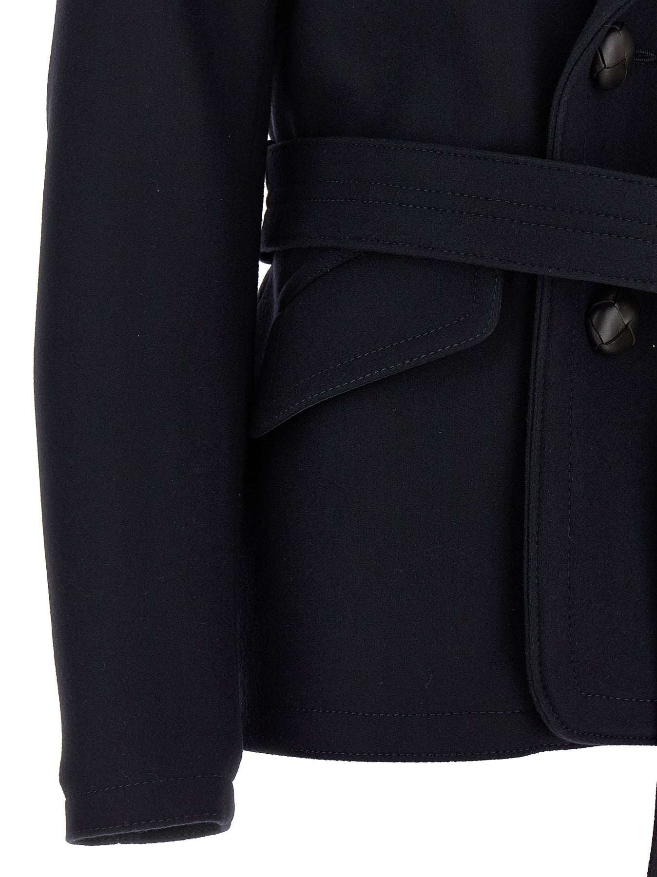 Peacoat Robe' wool coat with removable goose down padded insert, wide neckline, double-breasted caban style with front button closure, flap pockets, long sleeves, removable belt.