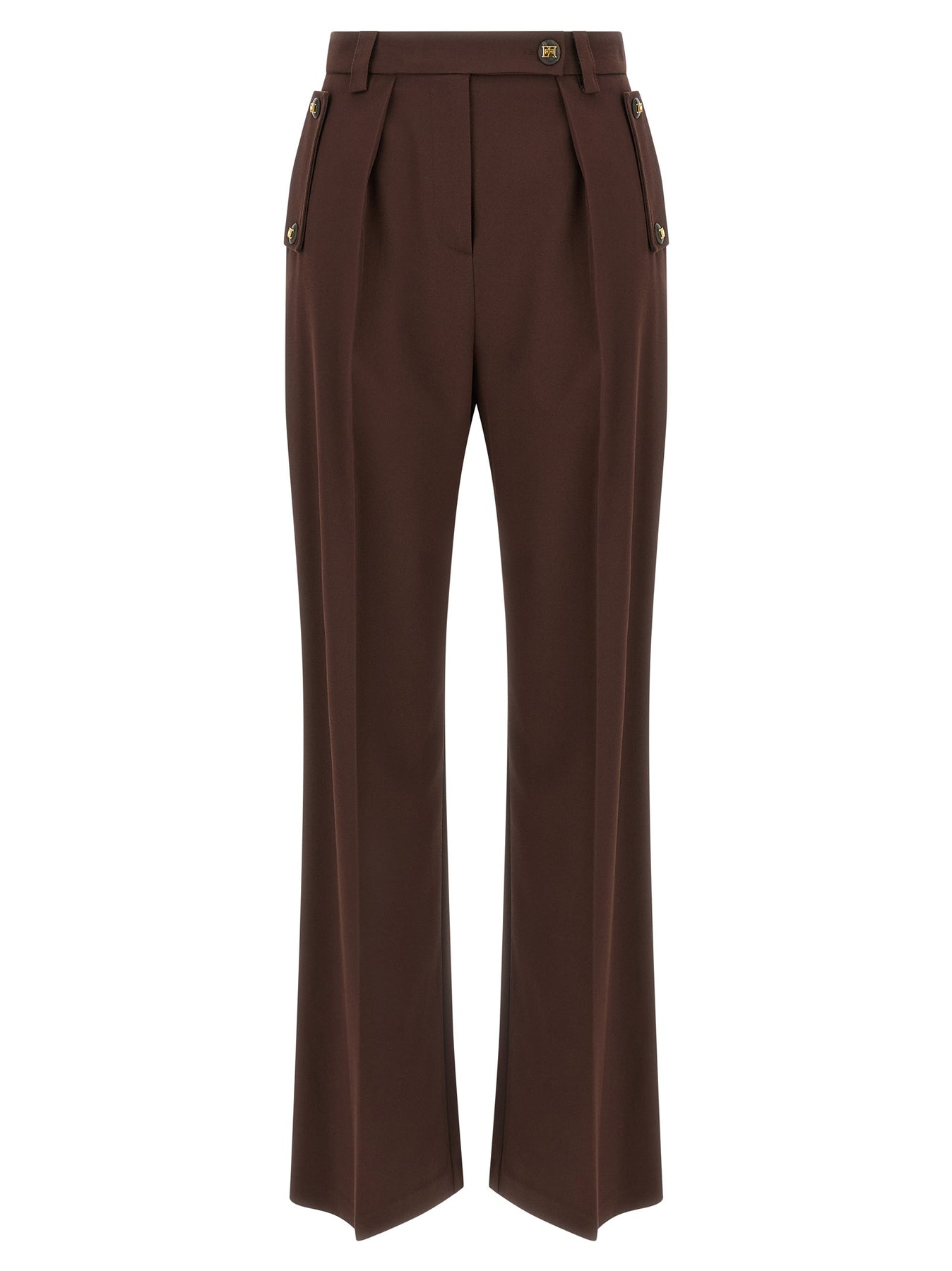 Viscose blend trousers with wide palace leg, pince, ironed pleat, zip hook and button closure on the front, pockets.