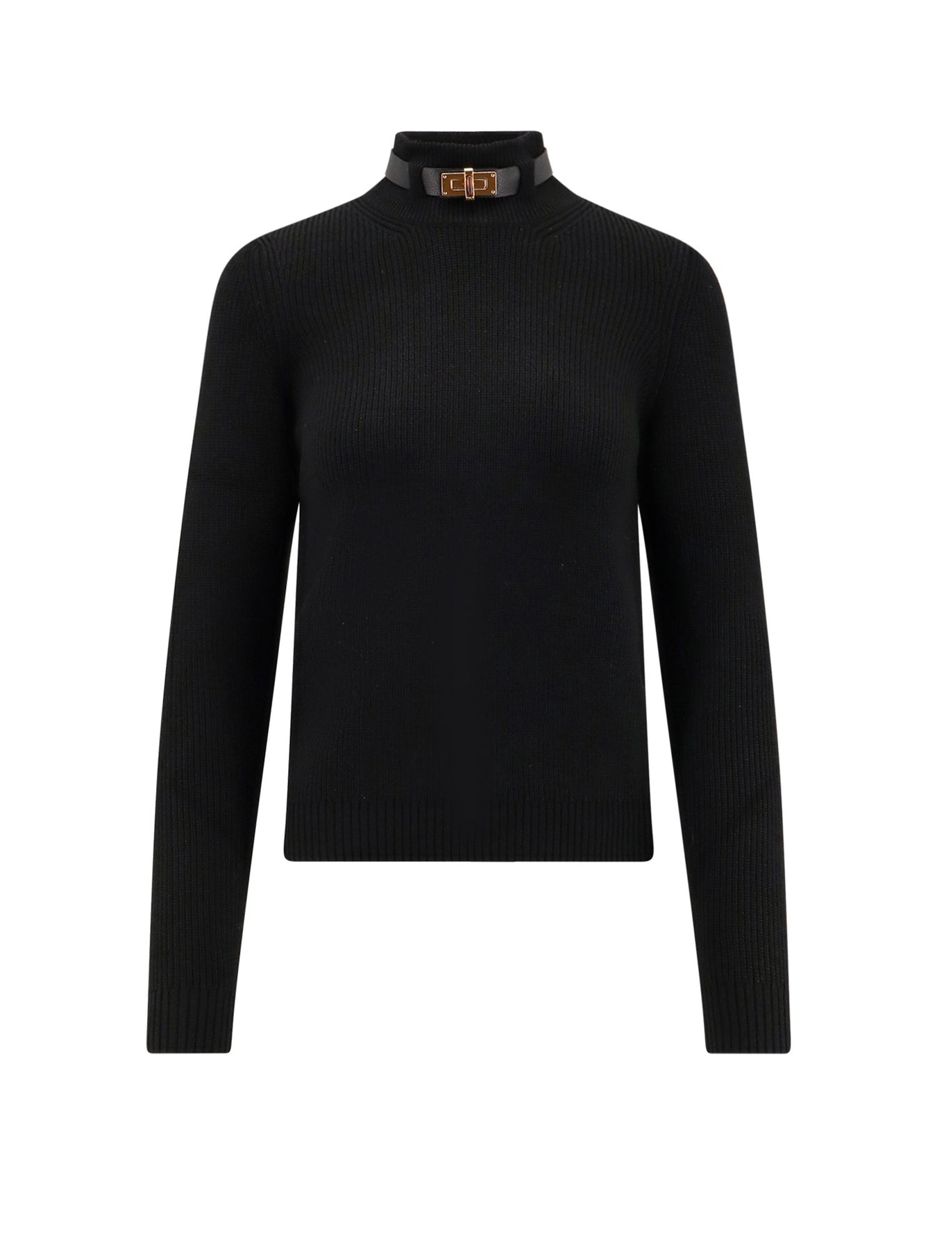 Leather strap with logo detail on the collar Turtleneck Long sleeves with cuffs Ribbed knit 50% wool, 50% acrylic SKU: MK05S56E2110