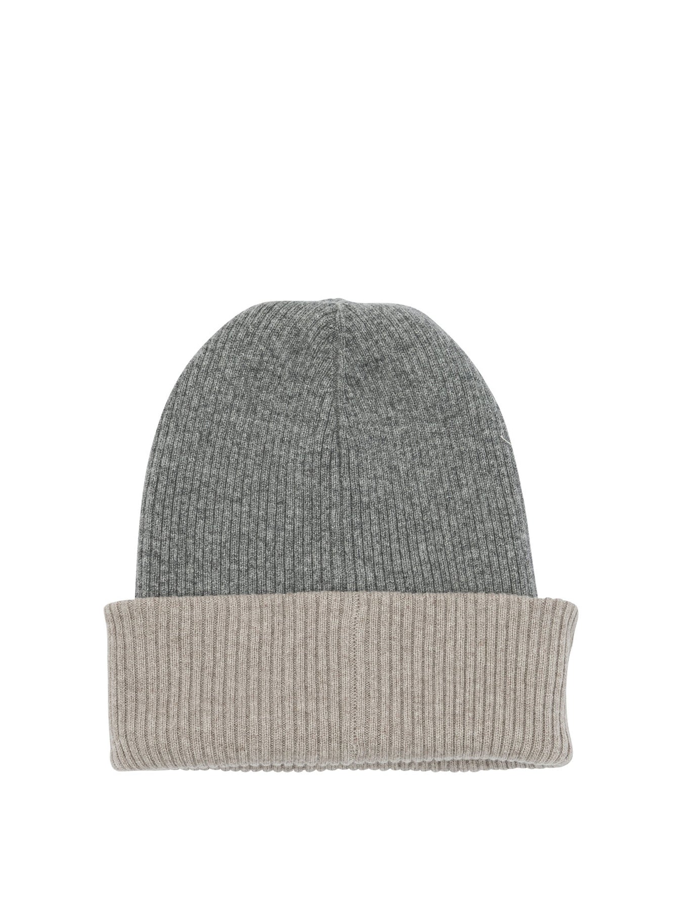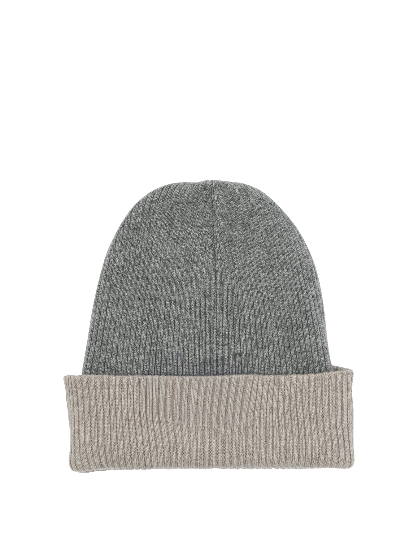Brunello Cucinelli reversible cashmere beanie, made of ribbed double knit with cashmere yarn. The structure features a fitted and flexible silhouette, characterized by a double-layer construction that allows the cap to be worn on both sides. The uniform ribbed knit ensures elasticity and shape stability, offering a soft feel thanks to the all-cashmere composition. || - Ribbed double knit - 100% cashmere - Shaped and elastic silhouette