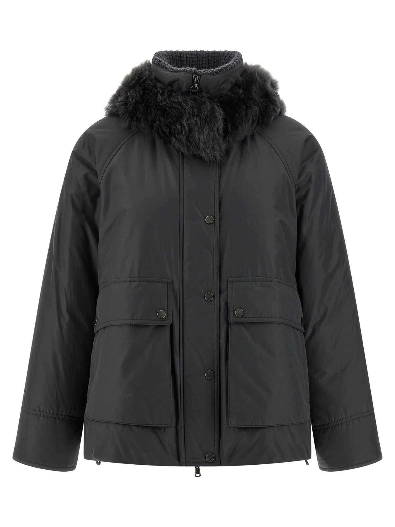 Cotton blend down jacket, quilted nylon lining and goose down padding, hood with removable fur outer side, ribbed cashmere high neck, zip closure with Monile 'Shiny Zipper Pull' and front snap buttons, pockets, long sleeves, elastic and drawstring on the hem.