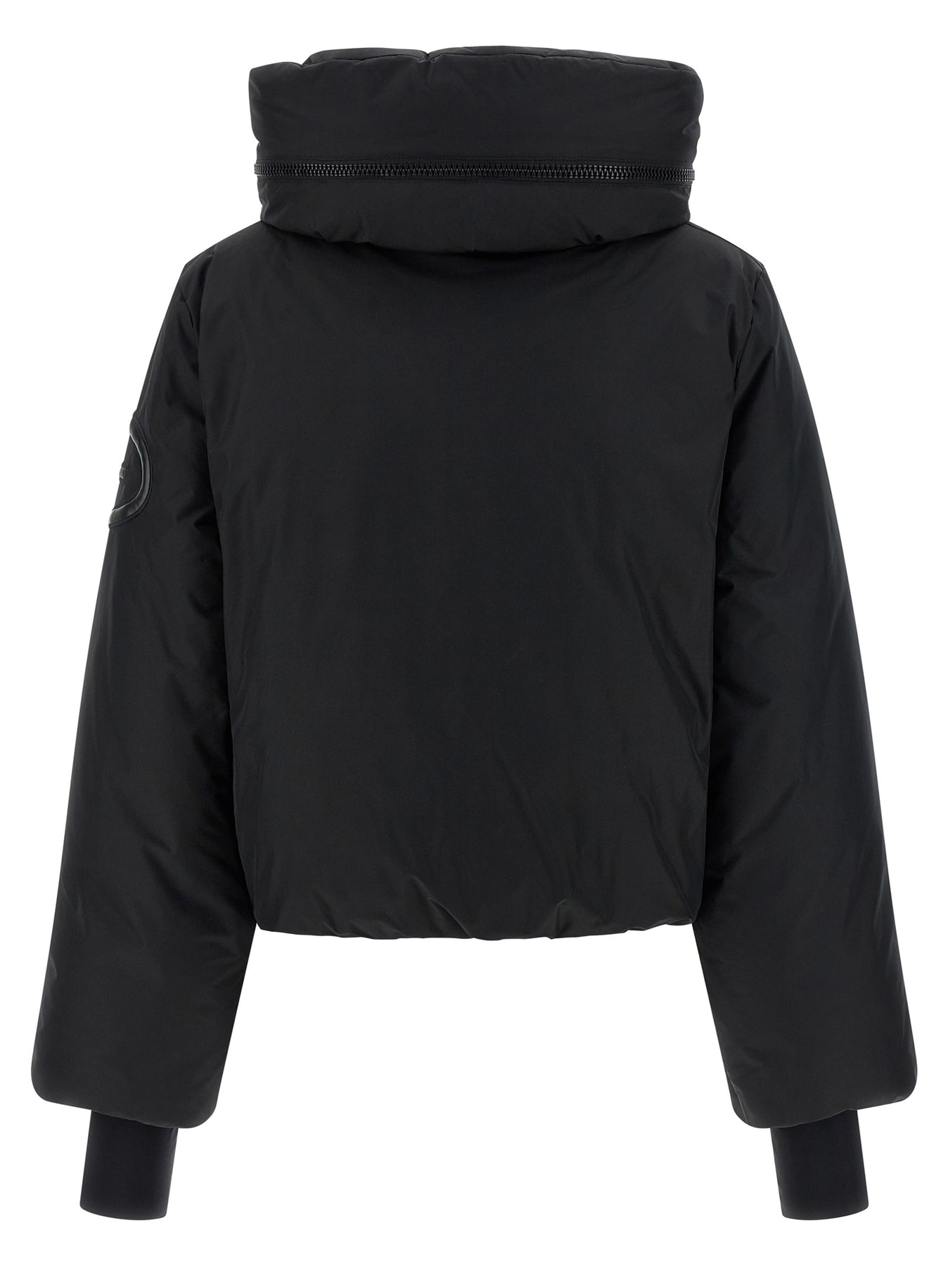 'Porter' ski down jacket in breathable and water-repellent technical fabric with goose feather padding, wide standing collar with removable hood, front zip closure, pockets, long sleeves with windproof gaiter and tone-on-tone logo patch applied, elastic with drawstring on the hem, removable inner gaiter on the hem, inner shoulder strap for transport. SUSTAINABLE: Product made with recycled materials.