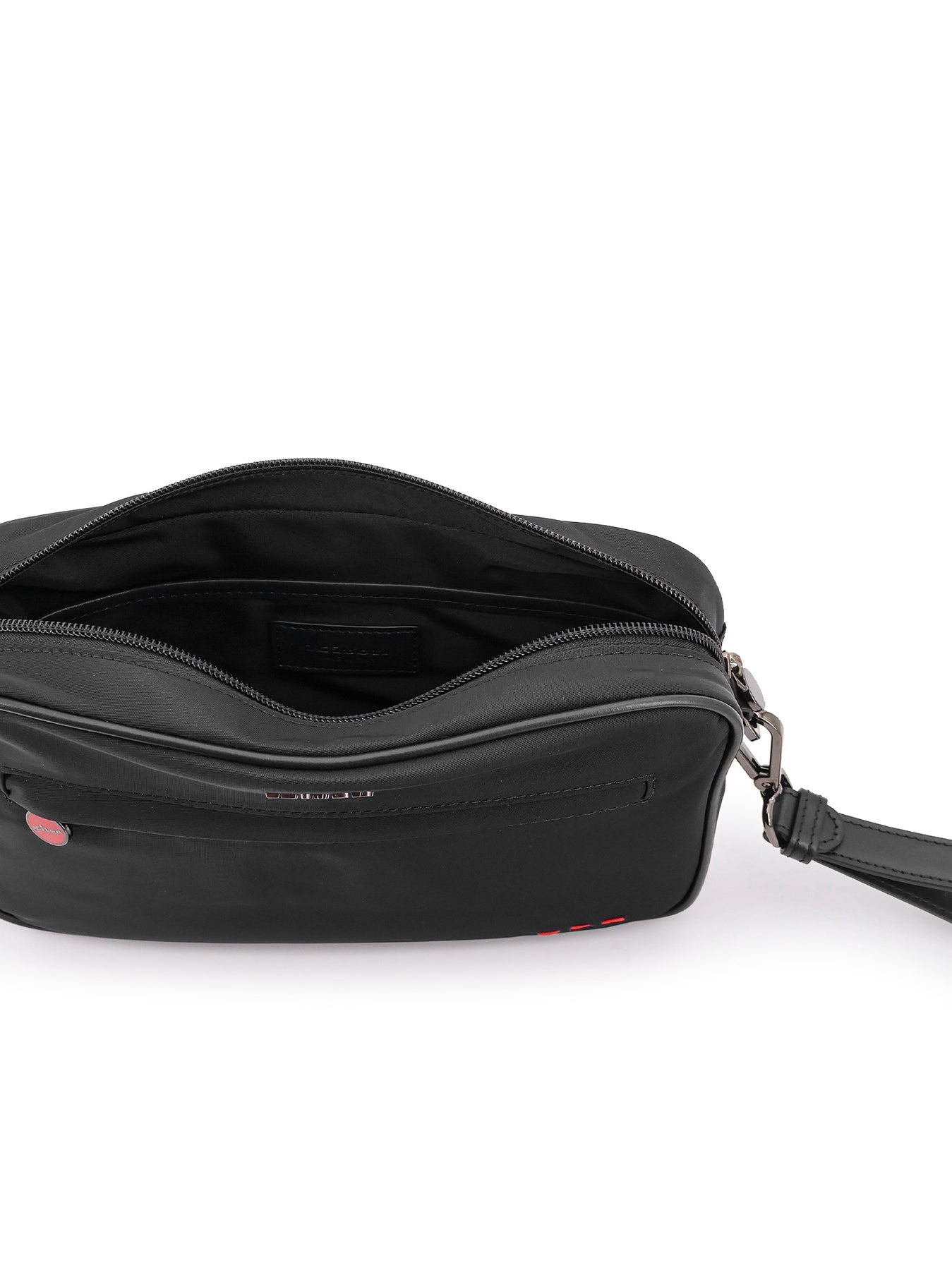 Zip closure Removable leather handle and one external zip pocket One internal flat pocket Made in Italy Nylon/leather W: 25.5 cm x H: 16 cm x D: 6 cm SKU: UBA0052N0127001NERO