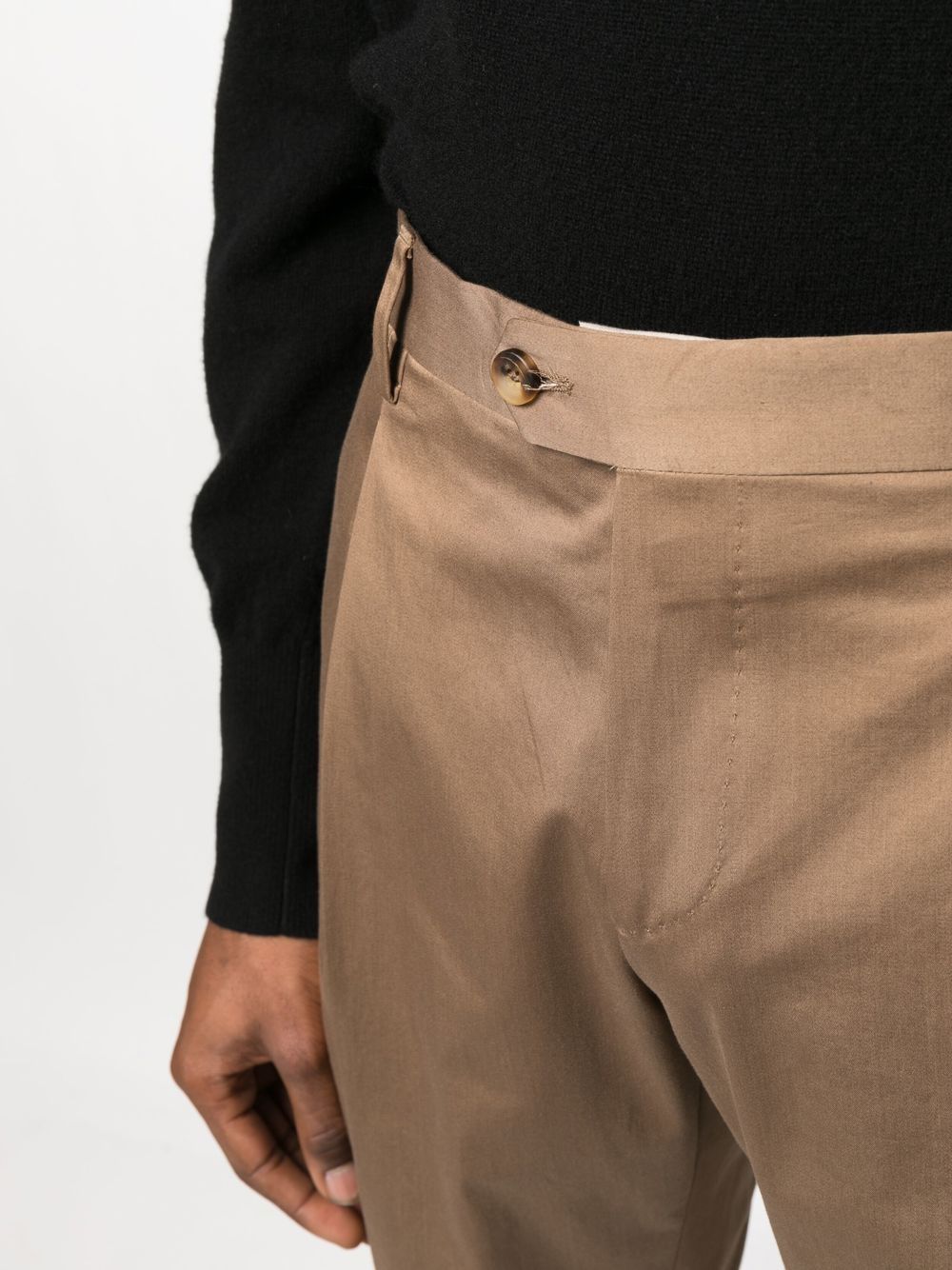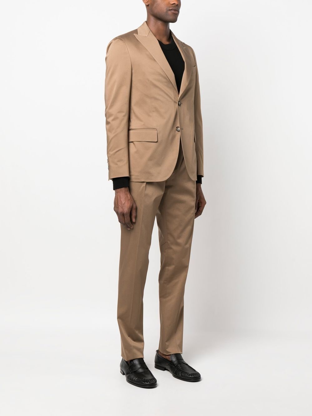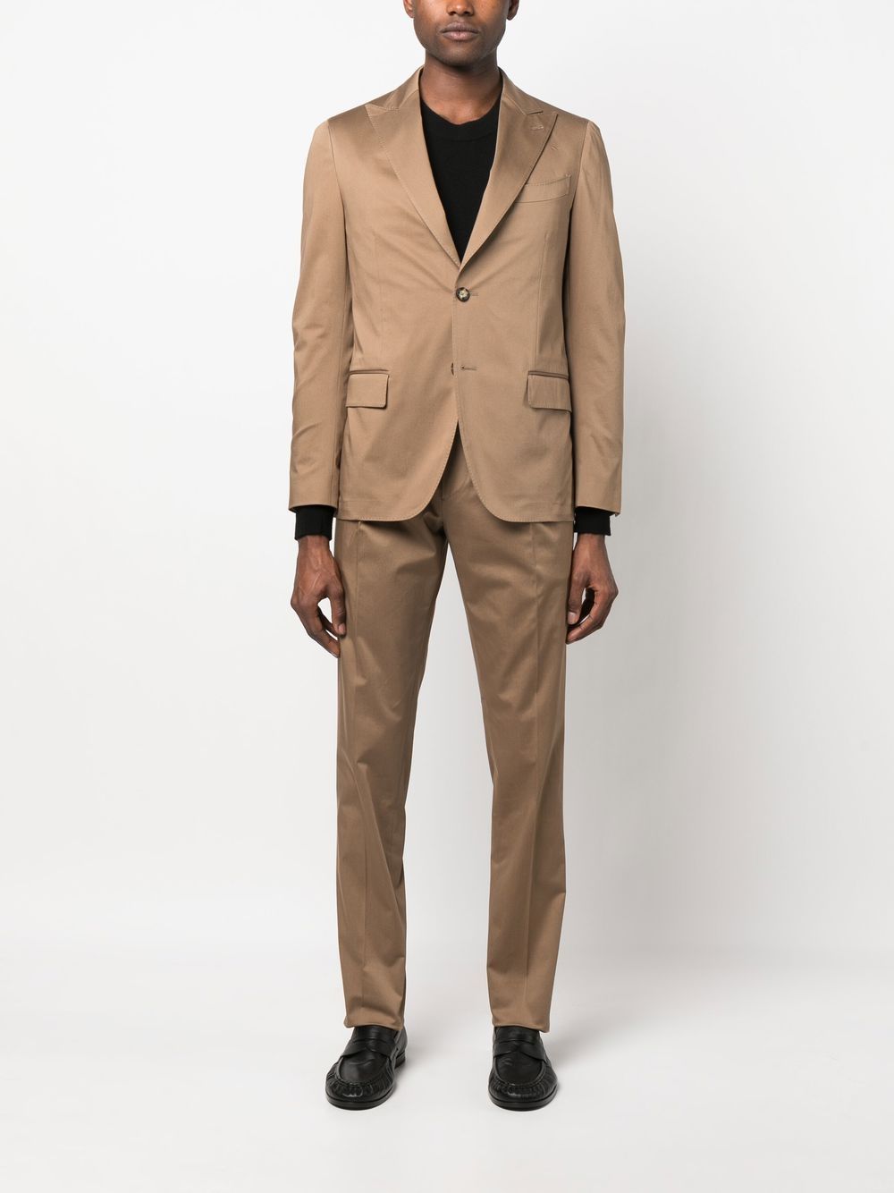 single-breasted two-piece suit from LARDINI featuring brown, stretch-cotton, peak lapels, chest welt pocket, button fastening, two front patch pockets, long sleeves, buttoned cuffs, mid-rise, button fly fastening, belt loops, two side slit pockets, rear welt pocket and straight leg.