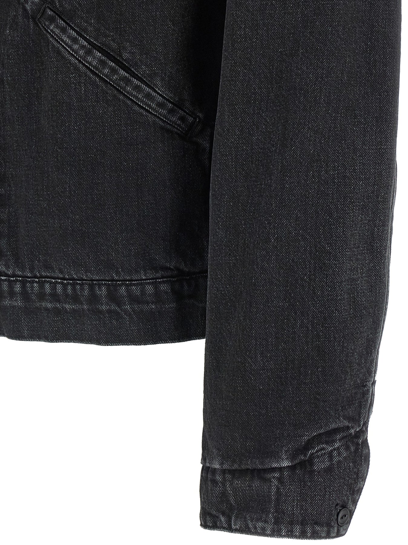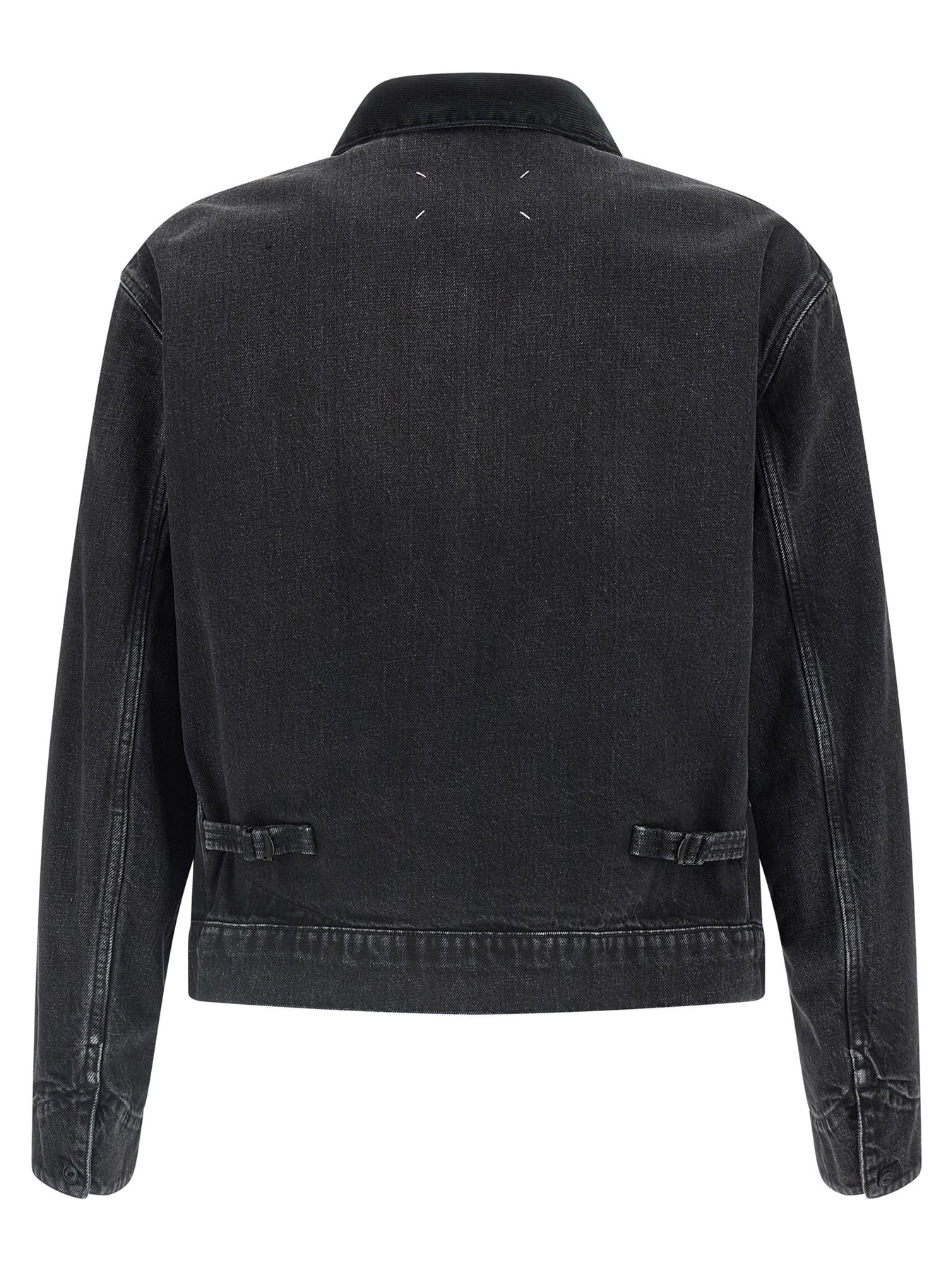 Workwear jacket in used-effect Japanese cotton denim with corduroy collar with raw cut hem, pockets, long cuffed sleeves, 'Four Stitches' and adjustable straps at the back.