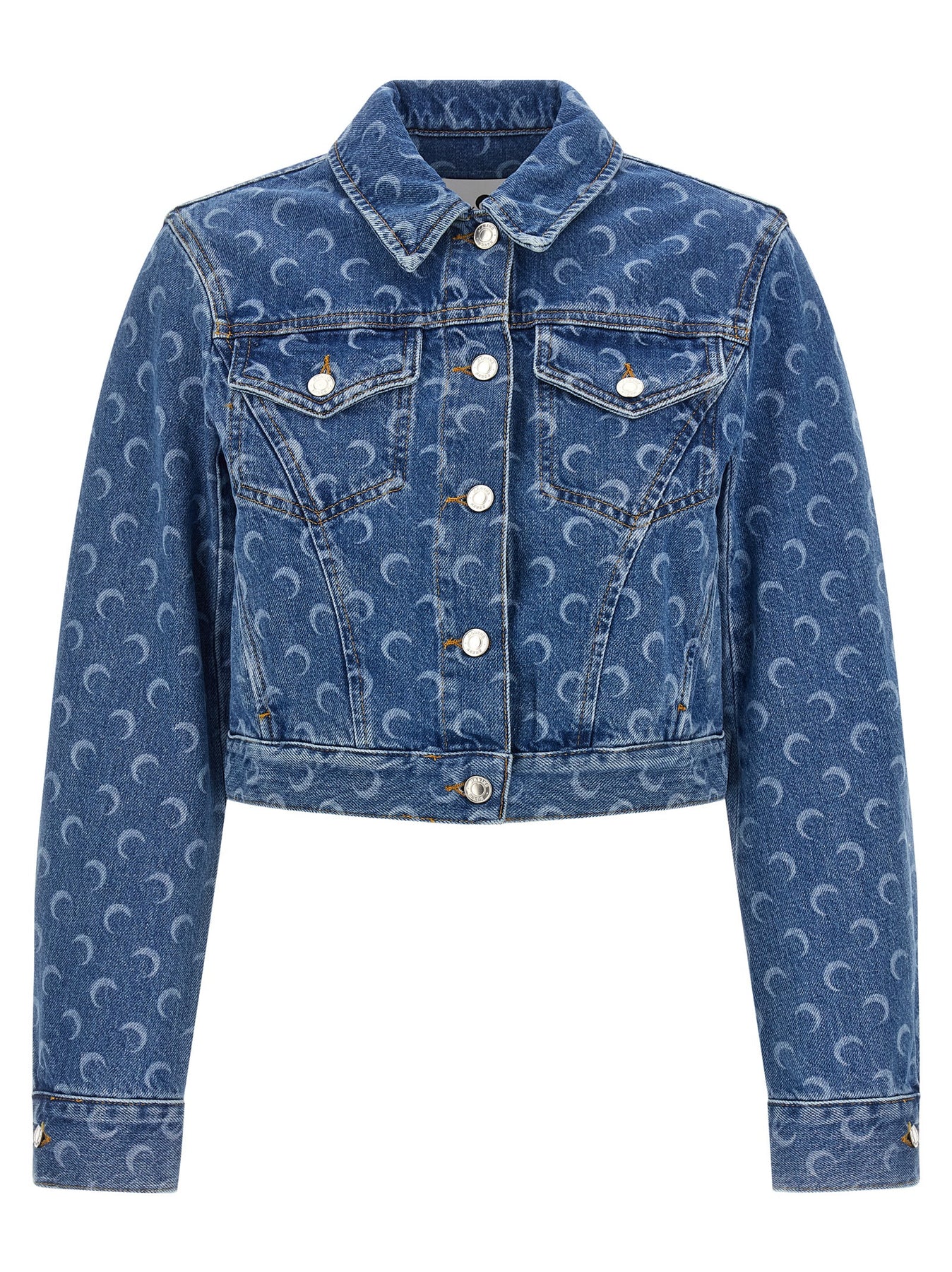 Cotton denim jacket with all-over laser 'Moon' print, contrast stitching, trucker crop style, shirt collar, front button closure, pockets, long cuffed sleeves, and leather logo patch at the back.