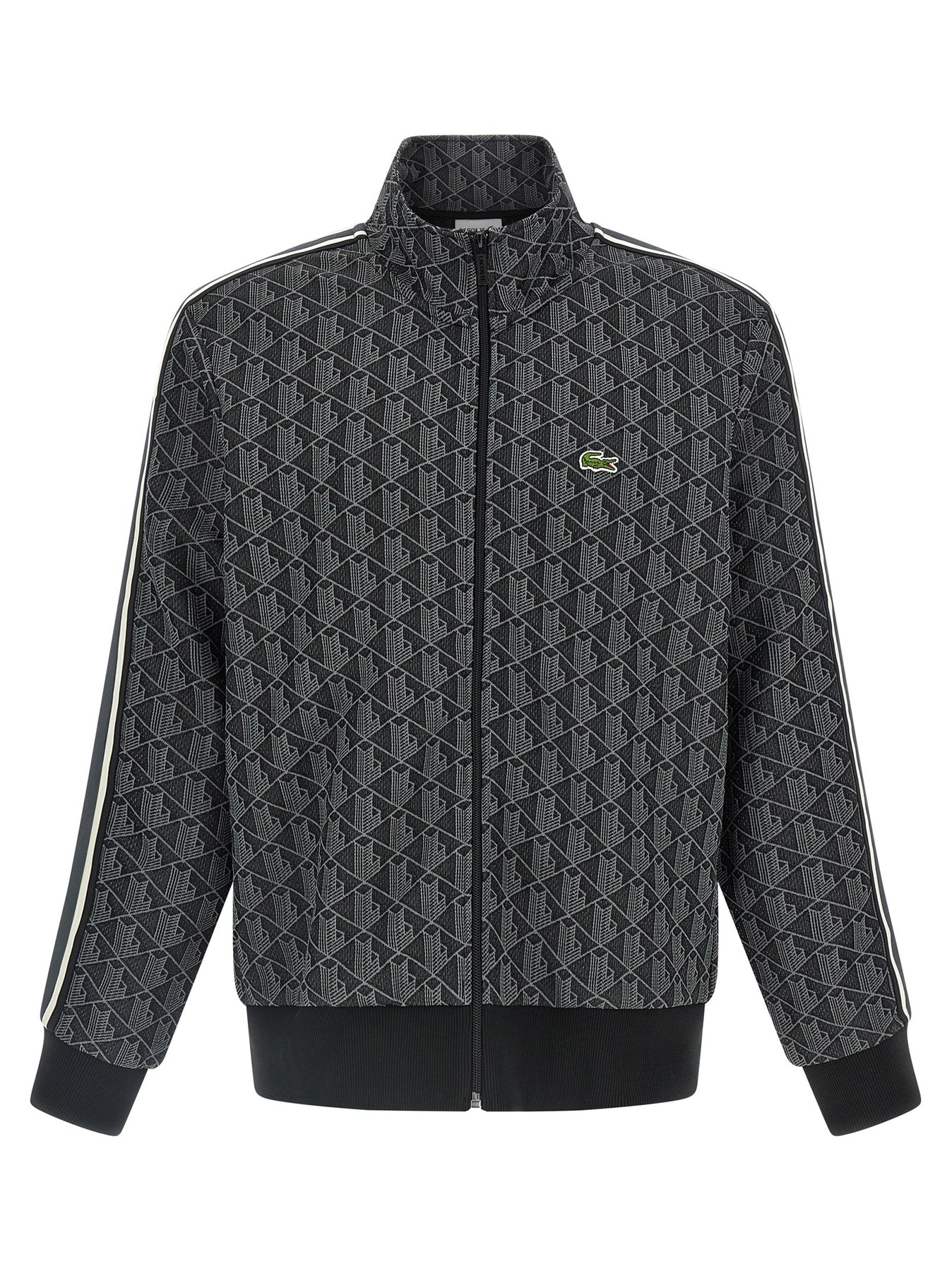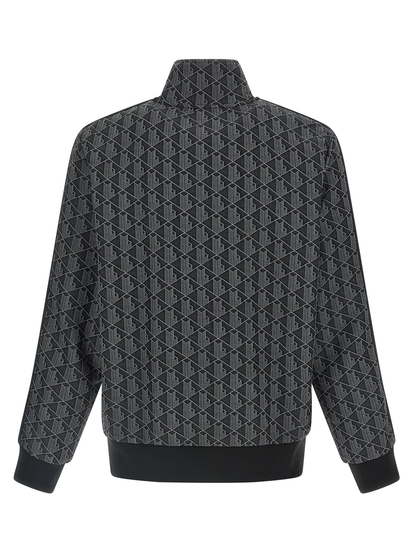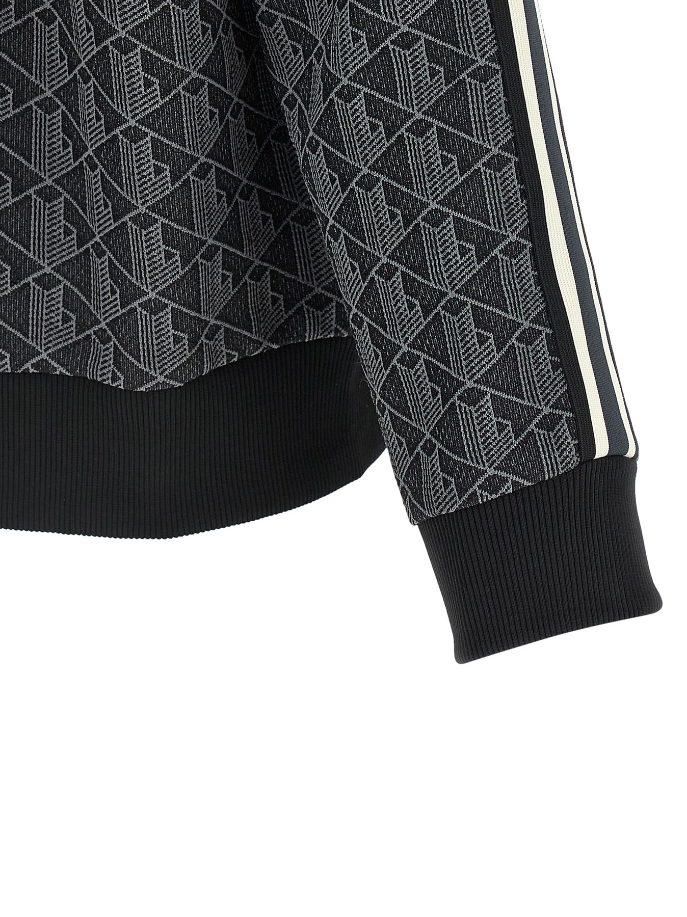 Paris' vintage jacquard monogram cotton blend sweatshirt with stretch ribbed knit details, high neck, logo patch and front zip closure, pockets, long cuffed sleeves and striped cotton detail.
