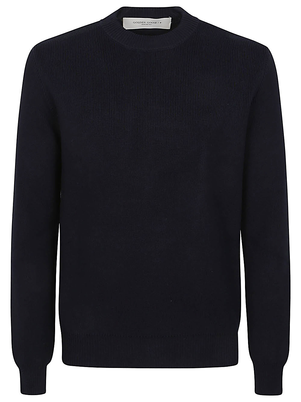 Dark blue cotton-blend ribbed-knit crew-neck jumper from Golden Goose featuring knitted construction, ribbed knit, logo patch to the rear, crew neck, long sleeves, logo patch at the sleeve, straight hem and ribbed-knit edge.