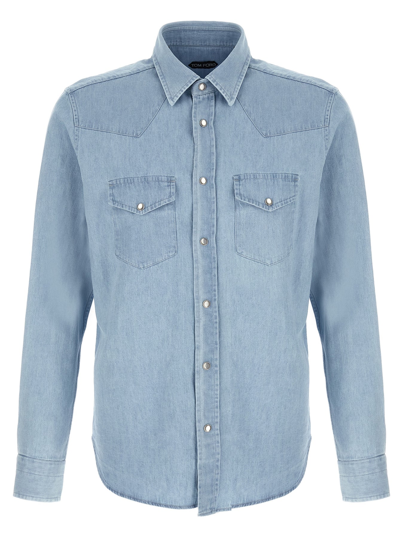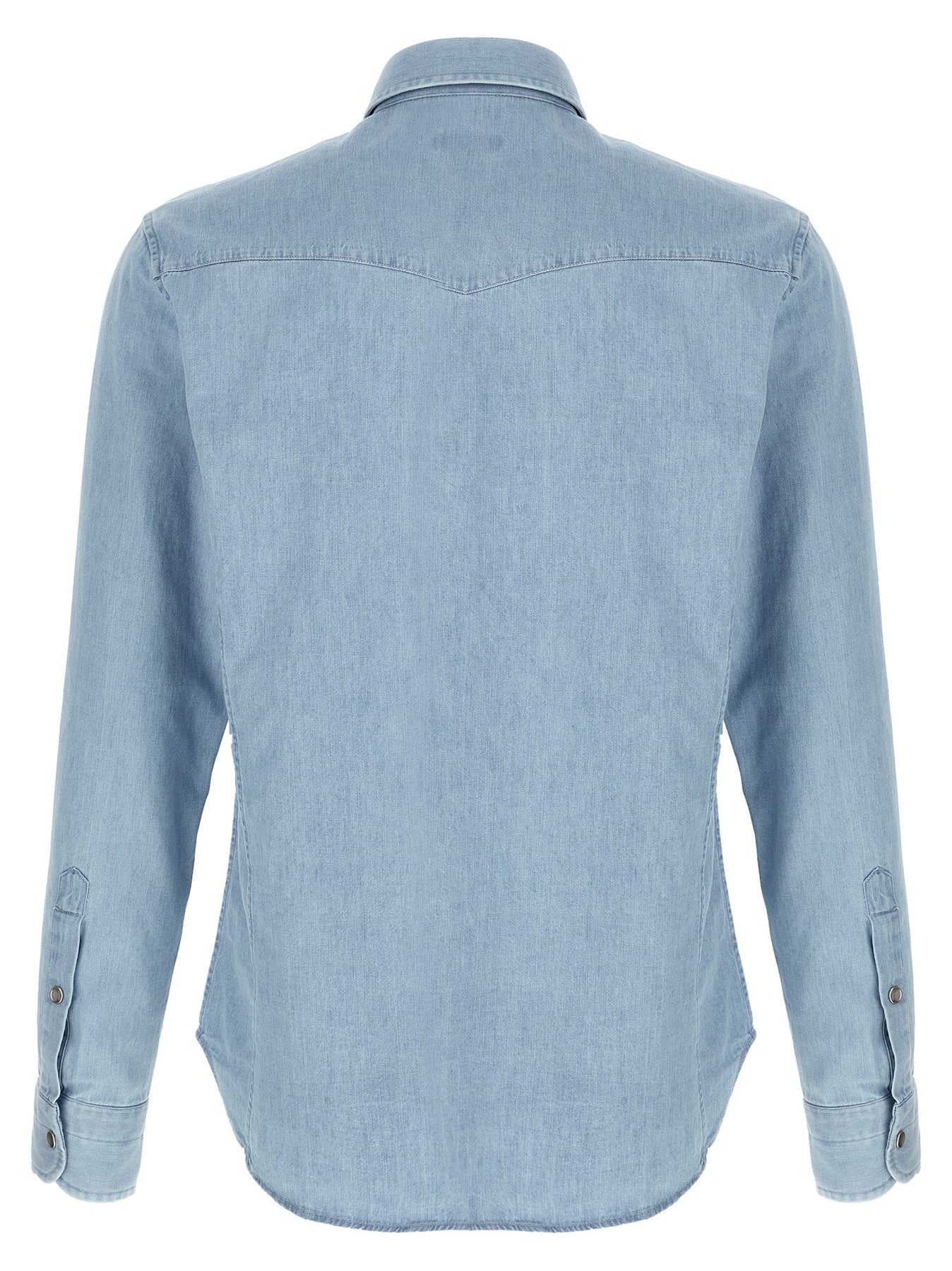 'Western' Chambray denim shirt with front snap button closure, pockets, long cuffed sleeves.