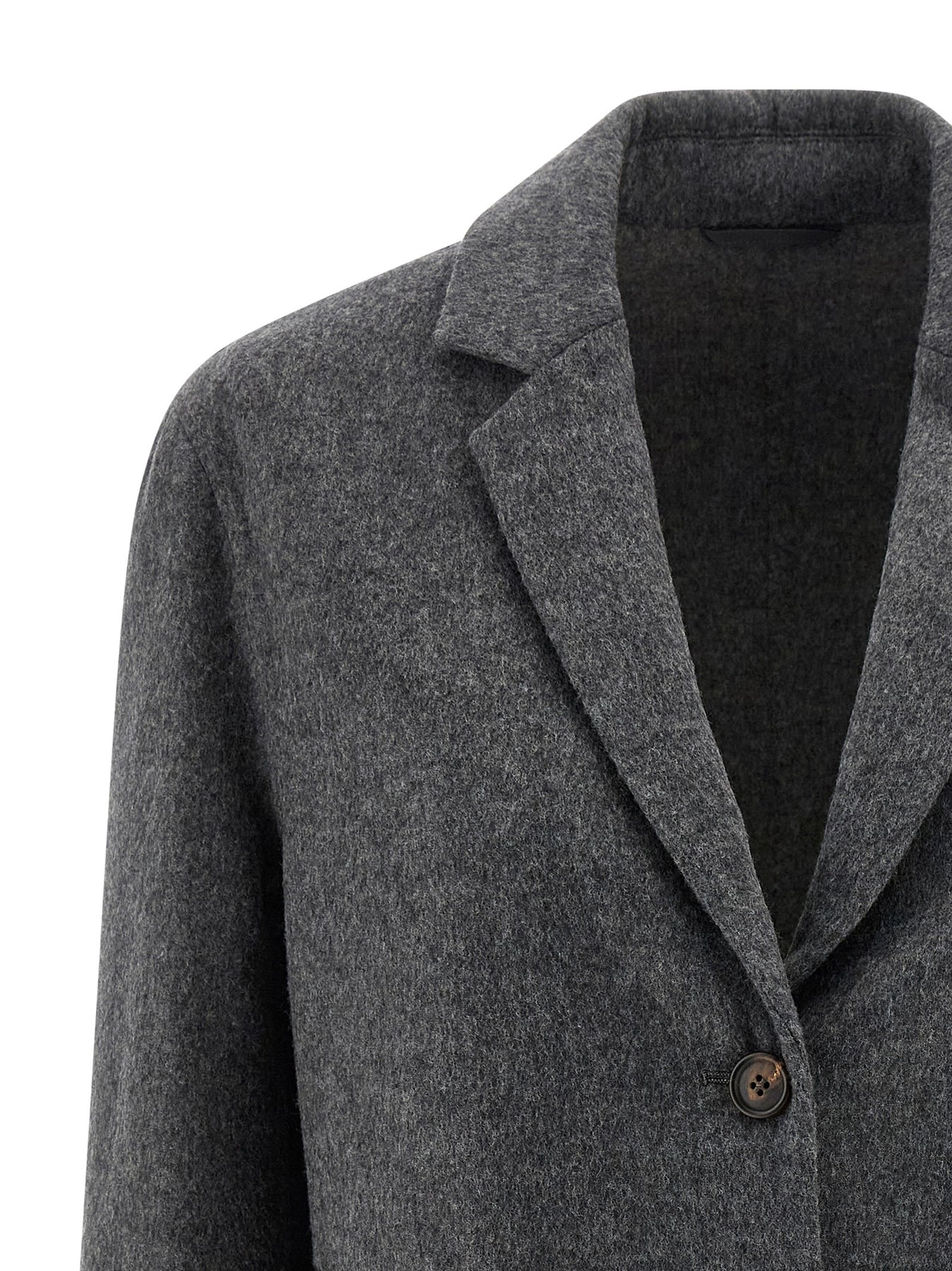 Double-knit 'Crop' single-breasted blazer in virgin wool cloth with front horn button closure, mirror lapels, flap pockets, long sleeves with dropped shoulders and Monile 'Shiny Cuffs' on the sleeve bottom, unlined.