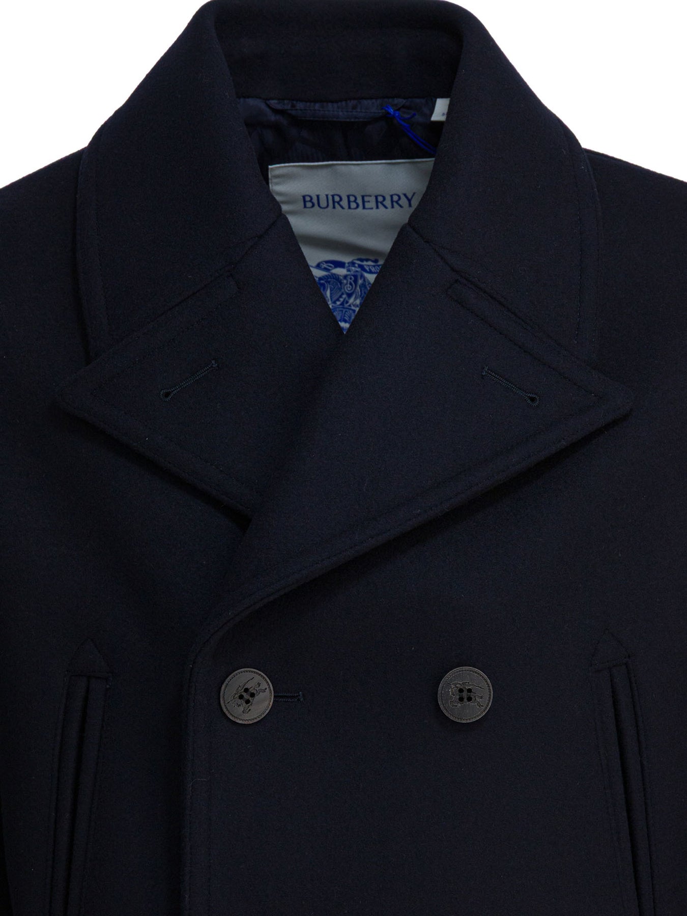 Burberry wool coat, double-breasted construction in wool main fabric with interior featuring tone-on-tone Check lining. The silhouette features regular line and defined structure. Undercollar combines cotton and wool, worked with Burberry Check pattern. Buttons engraved with Equestrian Knight Design. Present welt pockets at the front and flap pockets placed on the sides. Back slit for ease of movement. || - Solid color - Double-breasted - Cotton and wool undercollar with Burberry Check pattern - Buttons with engraved Equestrian Knight Design - Front welt pockets - Side flap pockets - Back slit - Tone-on-tone Check lining - Regular fit