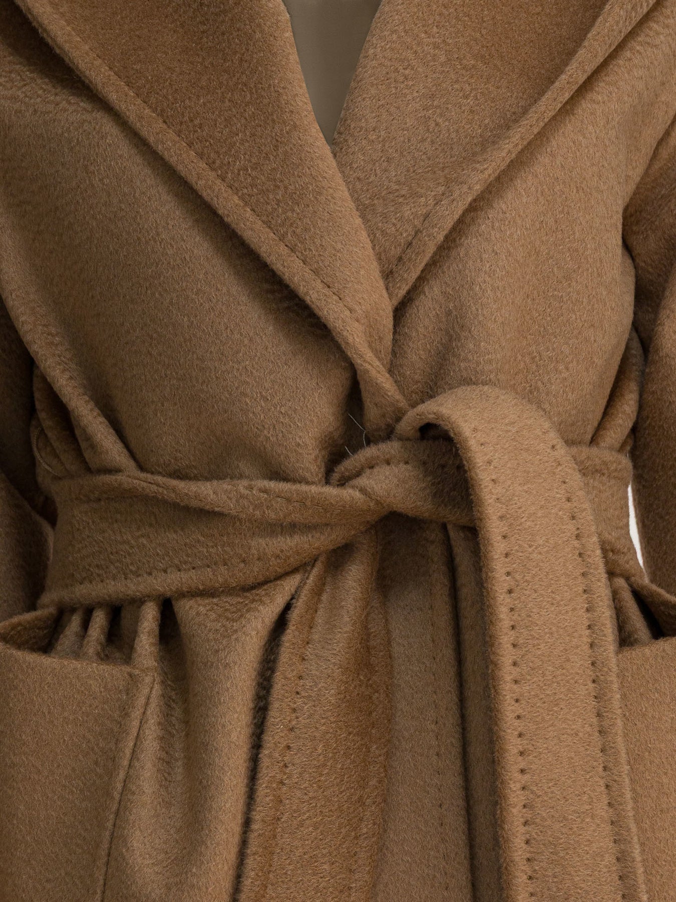 Max Mara camel robe coat crafted from pure camel sable drape. The structure features a wrap-around silhouette, integrated hood, and long round sleeves. Robe closure via matching belt, front patch pockets. The garment is finished with tailored dot, center back slit and fully lined for shape definition. || - Solid color - Pure camel sable drap - Integrated hood - Matching belt closure - Patch pockets on the front - Tailoring dot as a finish - Center back slit - Inner lining - Regular fit