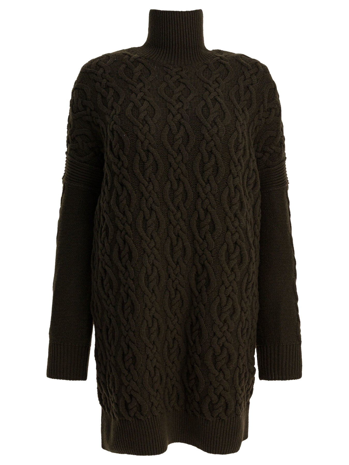 Max Mara wool and cashmere dress, knitted with braided stitch throughout. The short structure adheres to the body, enhanced by a tubular line from the shoulders to the bottom. The high collar and long sleeves provide even coverage. The edges are ribbed finished, providing stability to the opening and closing elements. The yarn composition combines softness and strength. || - Solid color - Sheath dress - Long sleeves - Integral braid stitch - High neck - Ribbed finished edges - Yarn composed of wool and cashmere - Relaxed fit