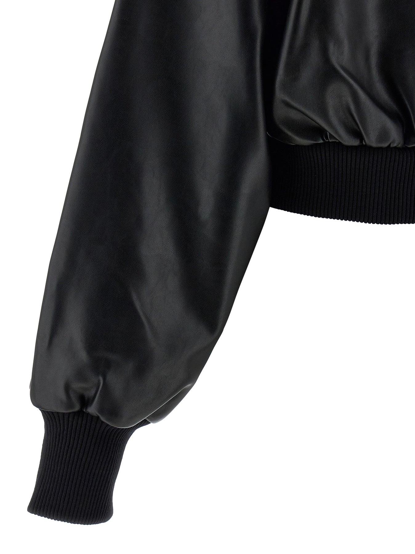 Bomber jacket in leather-effect fabric with stretch ribbed knit details, crop model, high neck, front zip closure, pockets, extra long sleeves with cuffs.