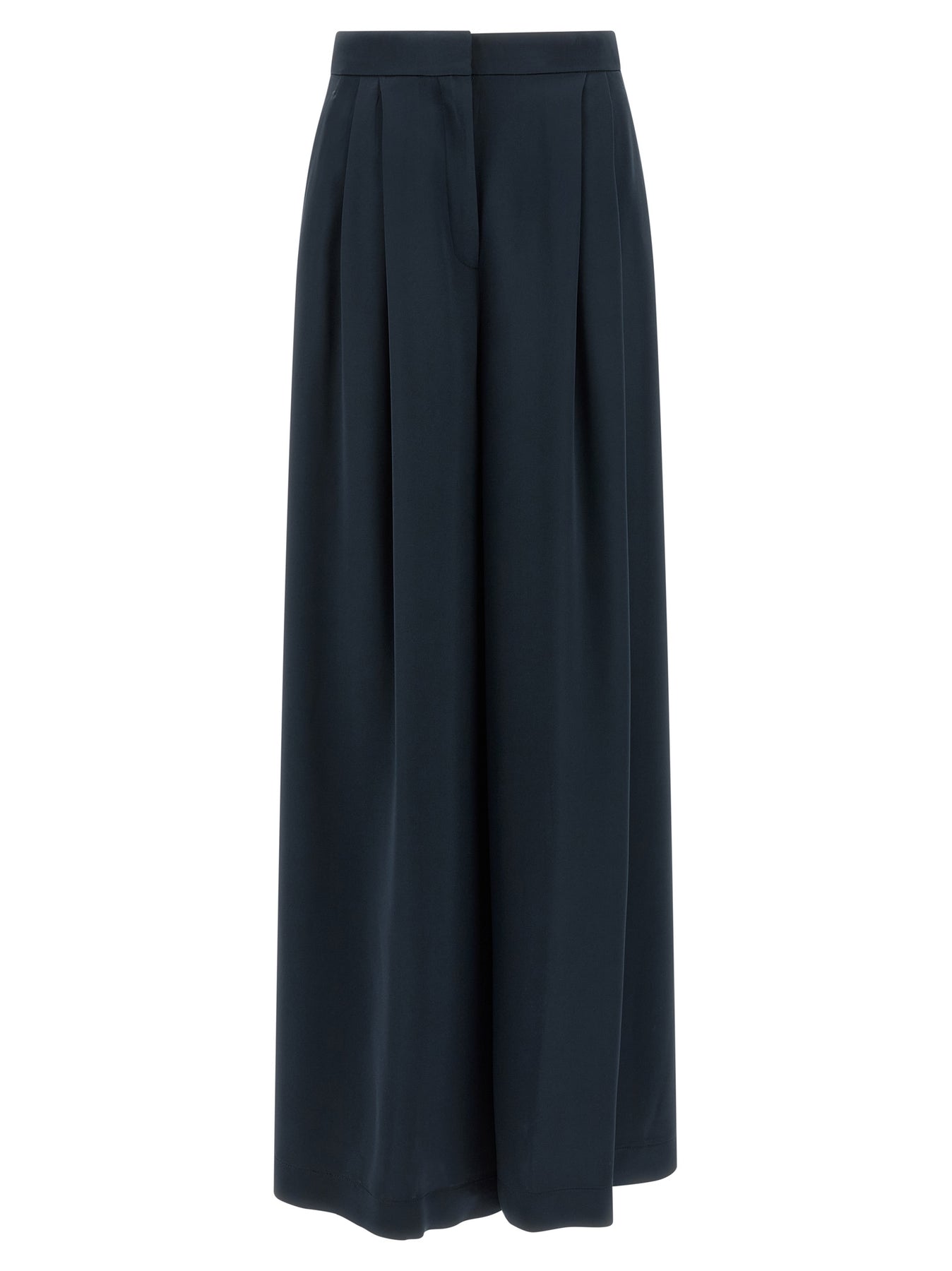 'Tetrix' palace pants in shiny satin, particularly wide silhouette on the hem, double pinces, zip hook and front button closure, pockets.