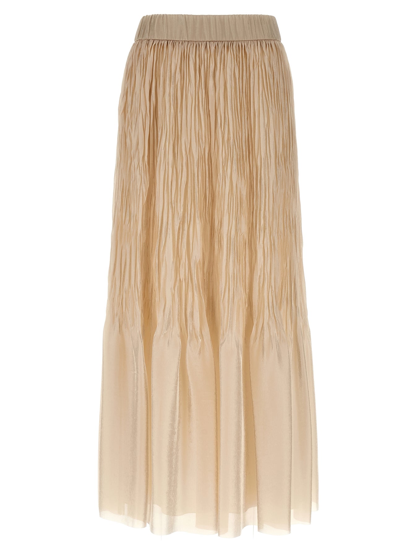 Long skirt in tie and dye and pleated fabric, elastic waistband, underskirt.