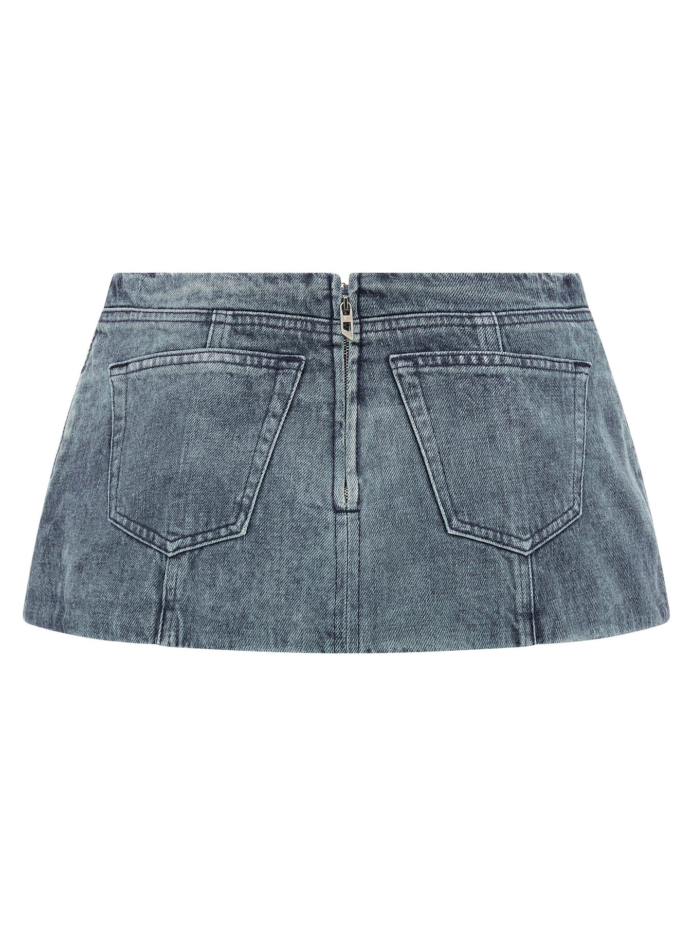 'De-Nora' stonewashed cotton denim miniskirt with streaks, pockets, back zip closure.