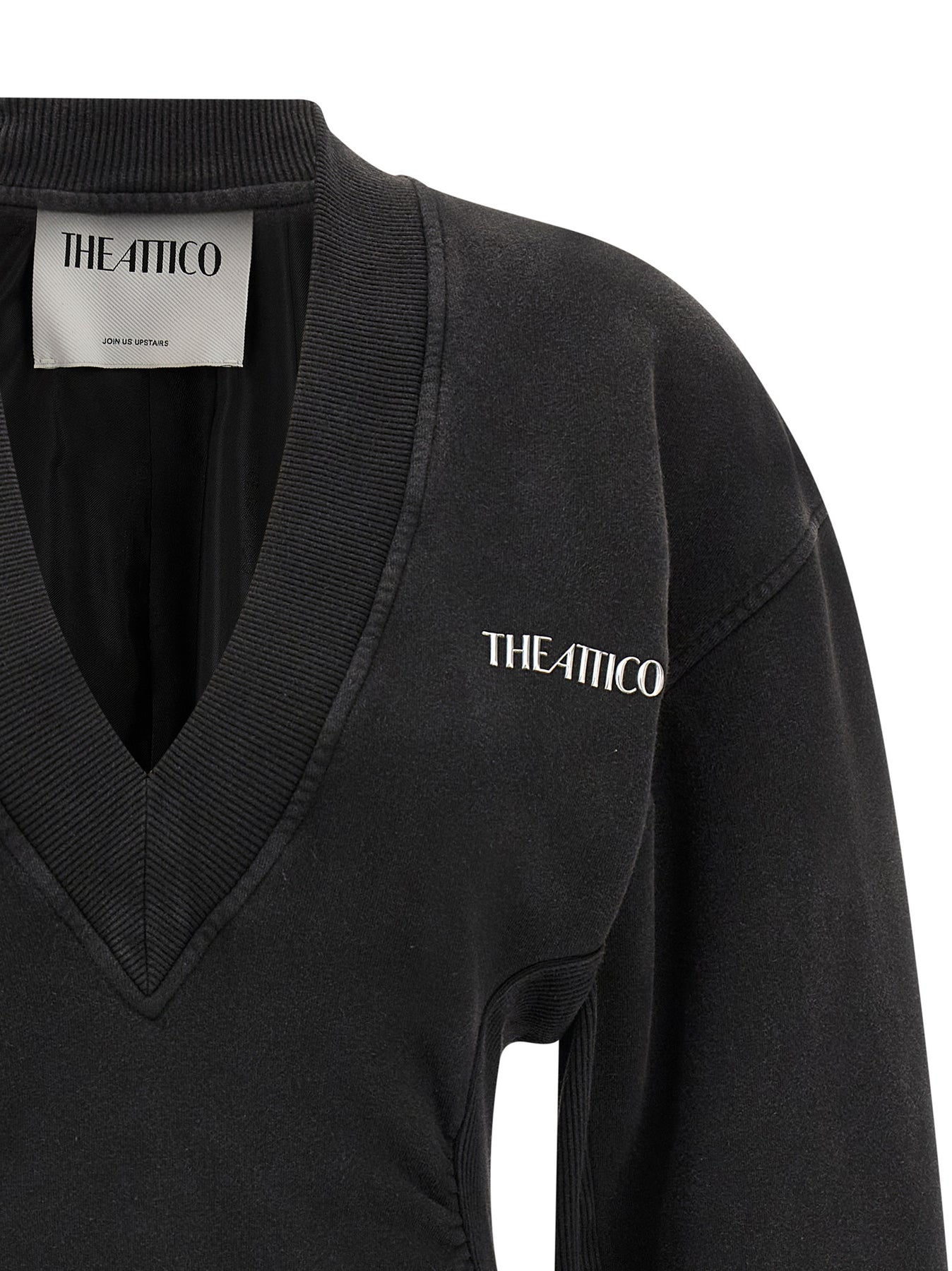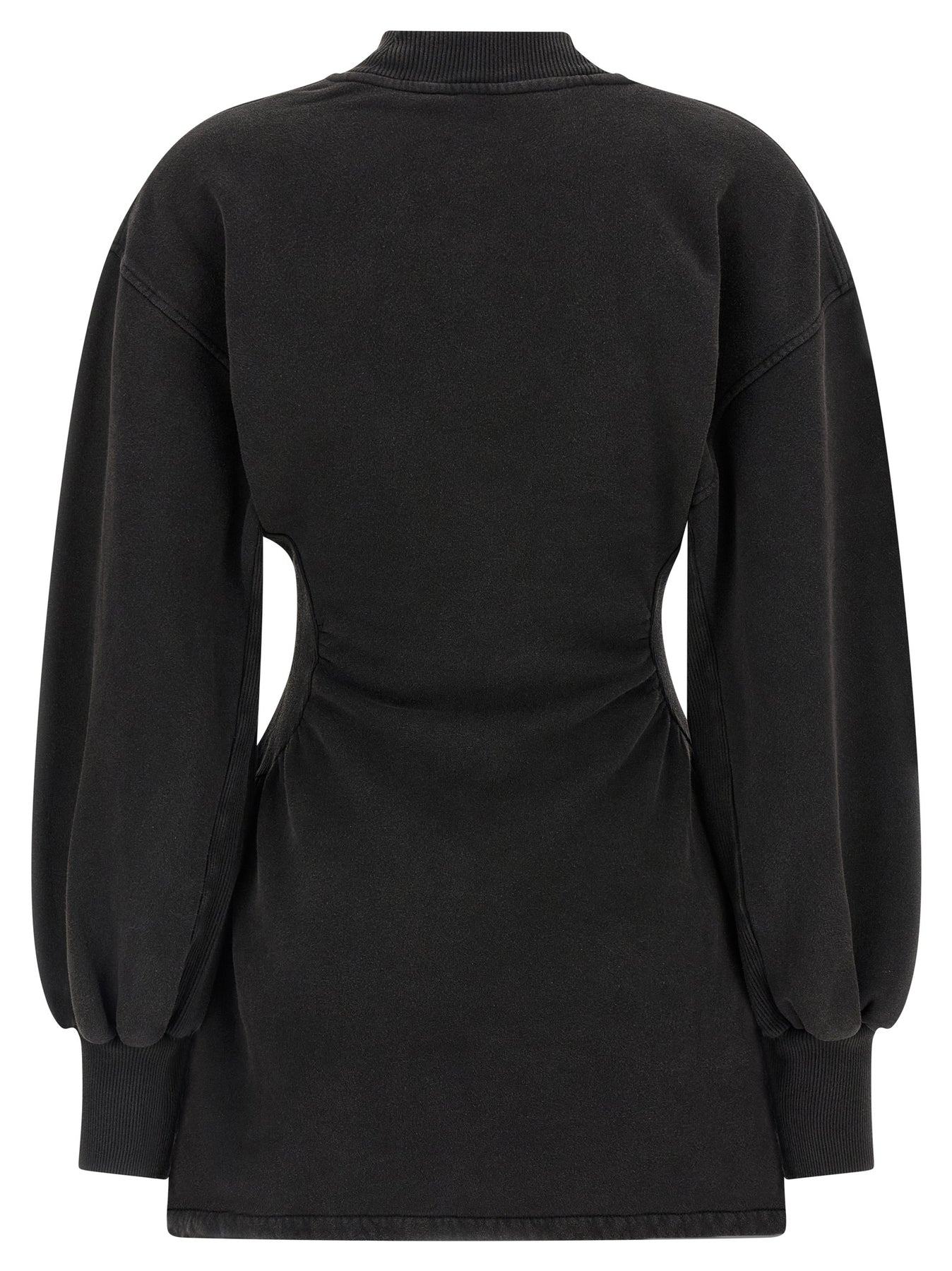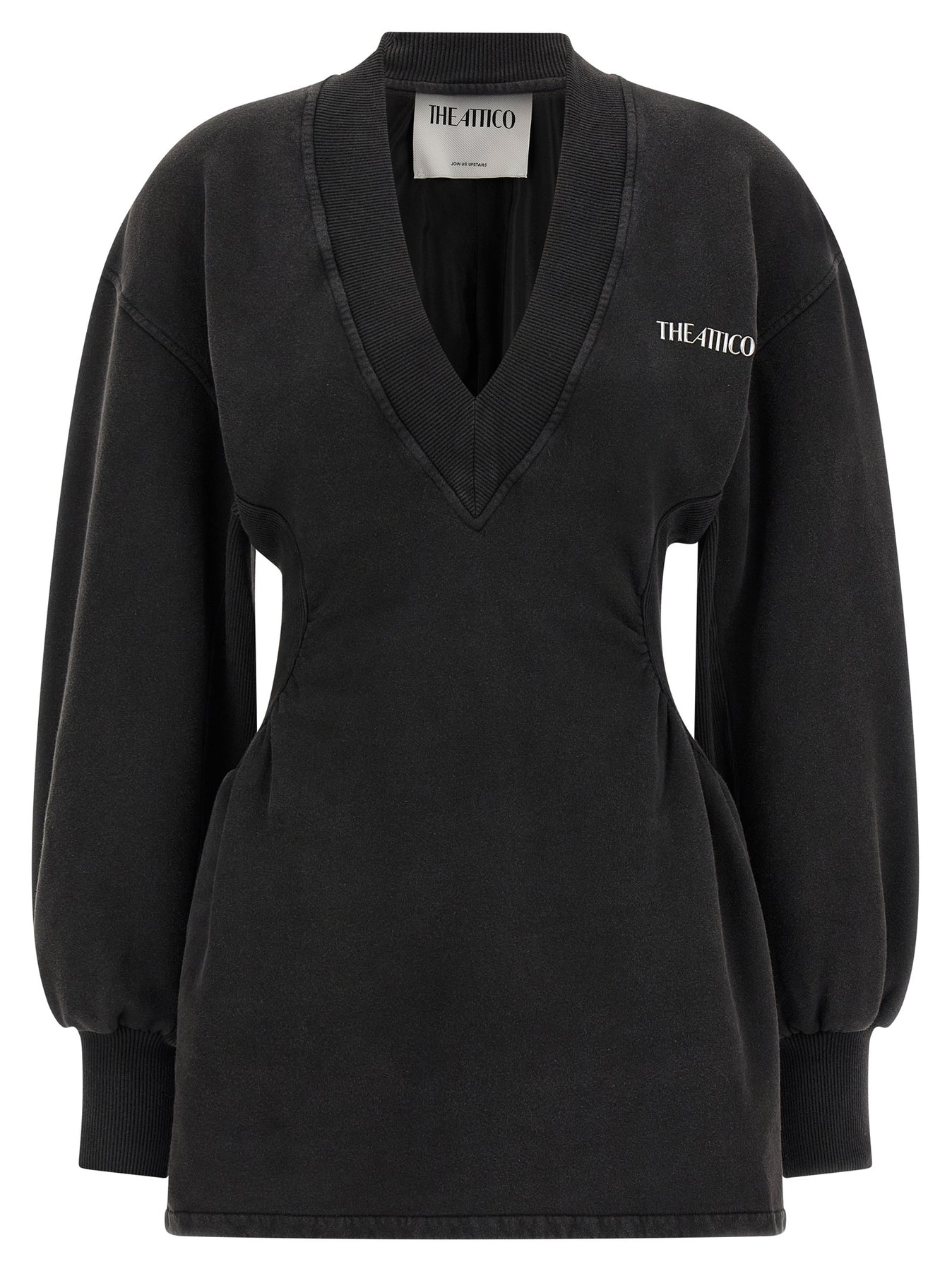Fleece mini dress, V-neck, front embossed logo embroidery, long cuffed sleeves, ribbed stretch cotton side inserts.