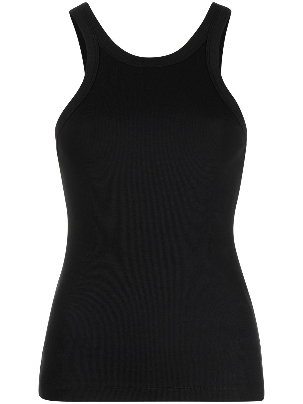 Black stretch-organic cotton Espera ribbed vest from TOTEME featuring fine ribbed, stretch design, round neck, sleeveless and straight hem.