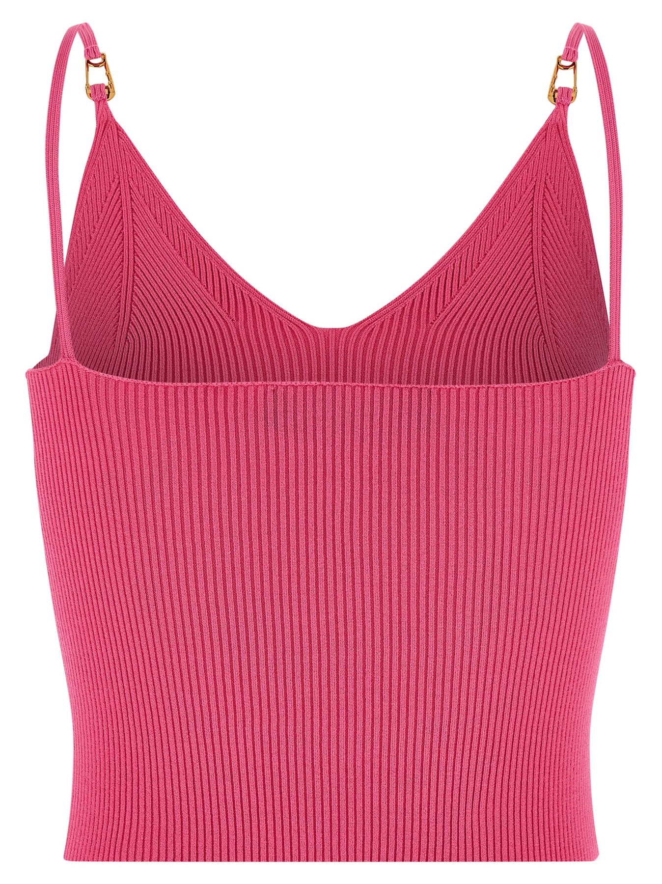Stretch ribbed knit crop top with V-neck, thin straps with metal 'Safety Pin' detail.