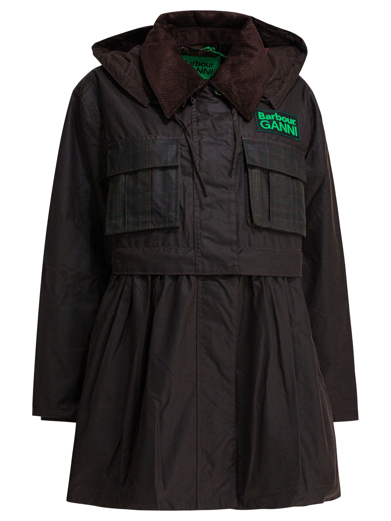 Barbour x GANNI jacket in waxed cotton with a weather-resistant finish. Structure features a field jacket-inspired top with tartan fabric patch pockets and a bounded waist that opens downward into a wide pleated skirt. Volumetric silhouette features pleated construction. Corduroy corduroy collar. Central zipper and snap button closure. Removable hood integrated into construction. || - Barbour GANNI logo embroidered on chest. - Front tartan patch pockets - Corduroy collar - Removable hood - Inside tartan lining - Zipper and snap button closure - Waxed cotton - Regular fit