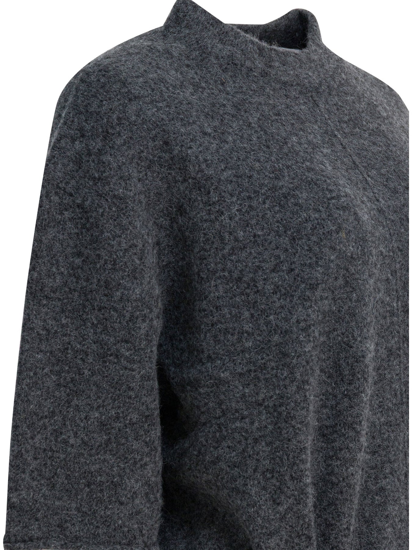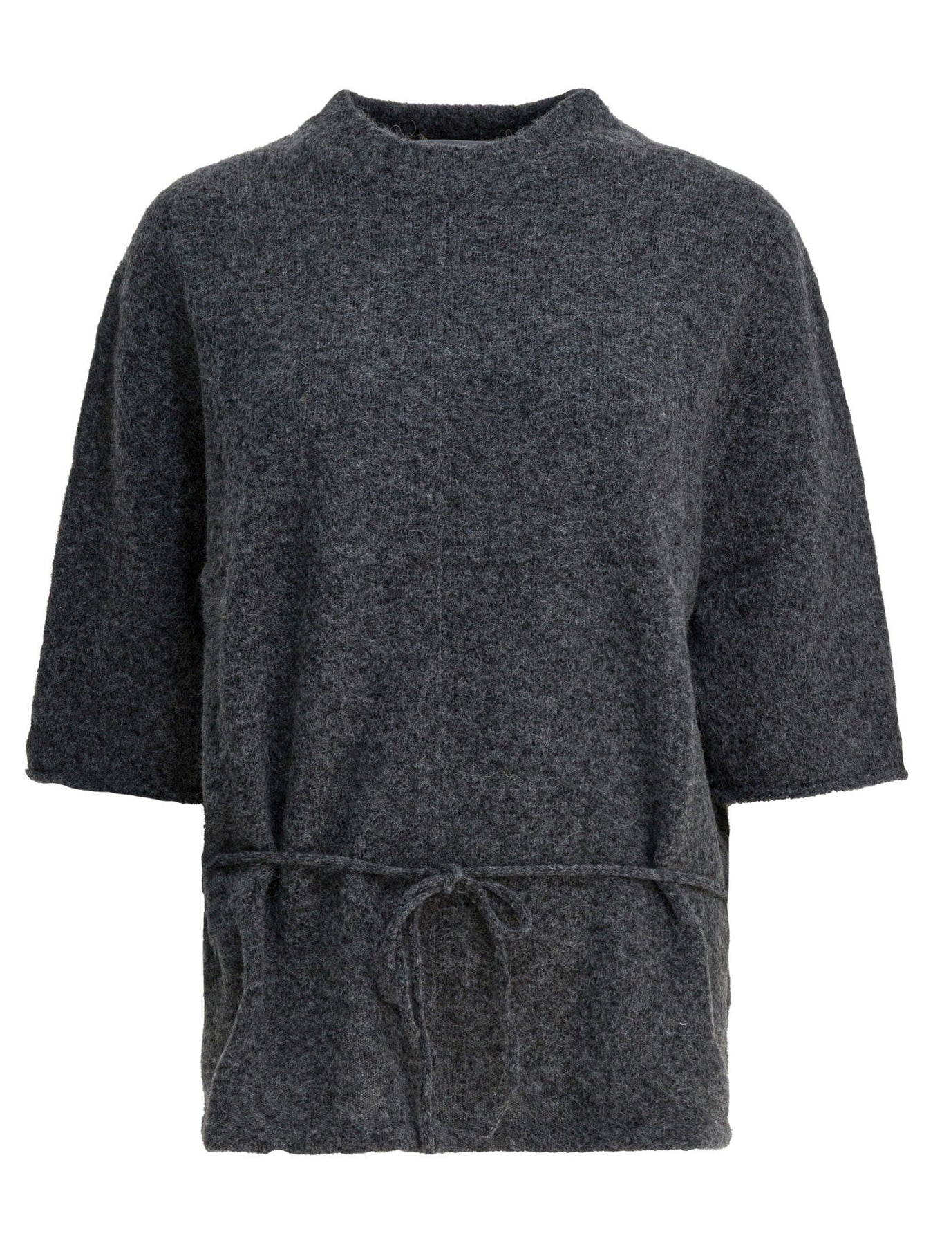Umarmung wool-blend crew-neck sweater with a compact knit structure and boxy silhouette. Made of a fiber blend that includes wool, alpaca and nylon, it features 3/4 sleeves and an integrated waist strap. The construction offers a loose fit and minimal detailing. The blended yarn ensures a soft weight and even surface, while the fabrication enhances the garment's essential shape. || - Solid color - 3/4 sleeves - Waistband - Oversize fit