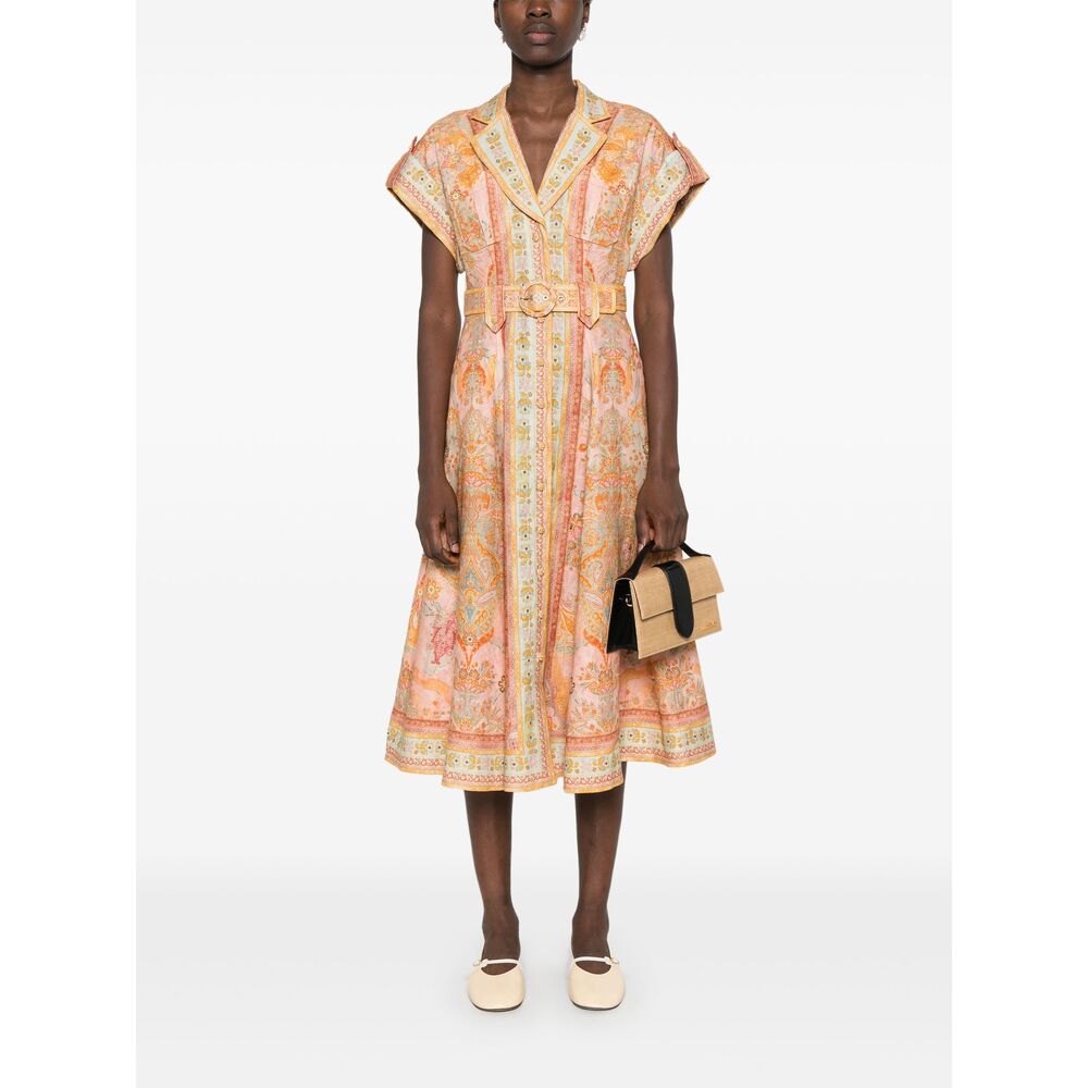 pink/multicolour linen slub texture front button fastening all-over graphic print notched collar short sleeves turn-up cuffs two chest patch pockets detachable waist belt belt loops two side slit pockets flared skirt unlined straight hem mid-length