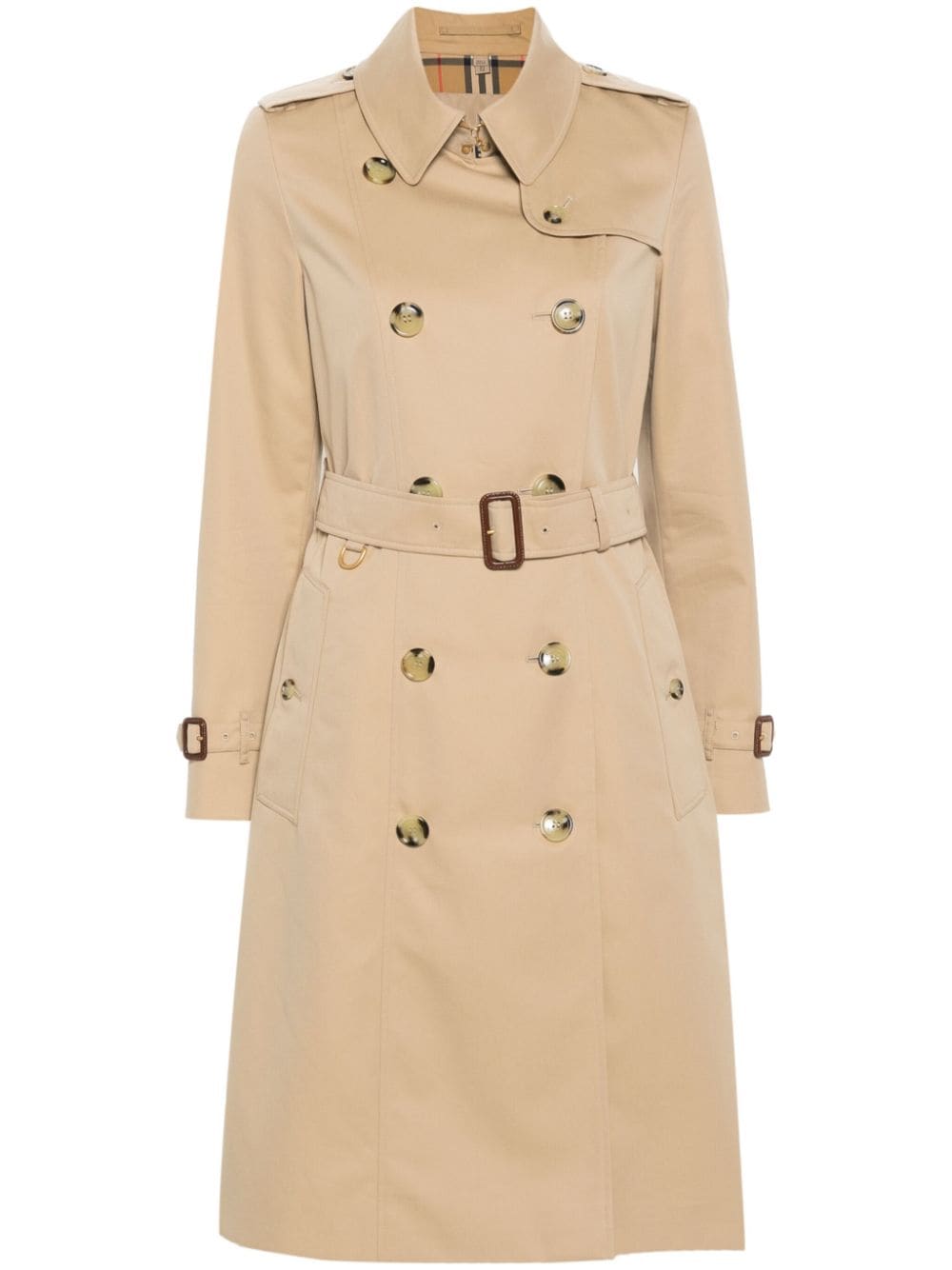 archive beige cotton gabardine weave tonal stitching classic collar epaulettes storm flap long sleeves with belted cuffs belt loops detachable and adjustable waist belt two side welt pockets knee-length central rear vent Vintage Check-pattern lining straight hem double-breasted button fastening