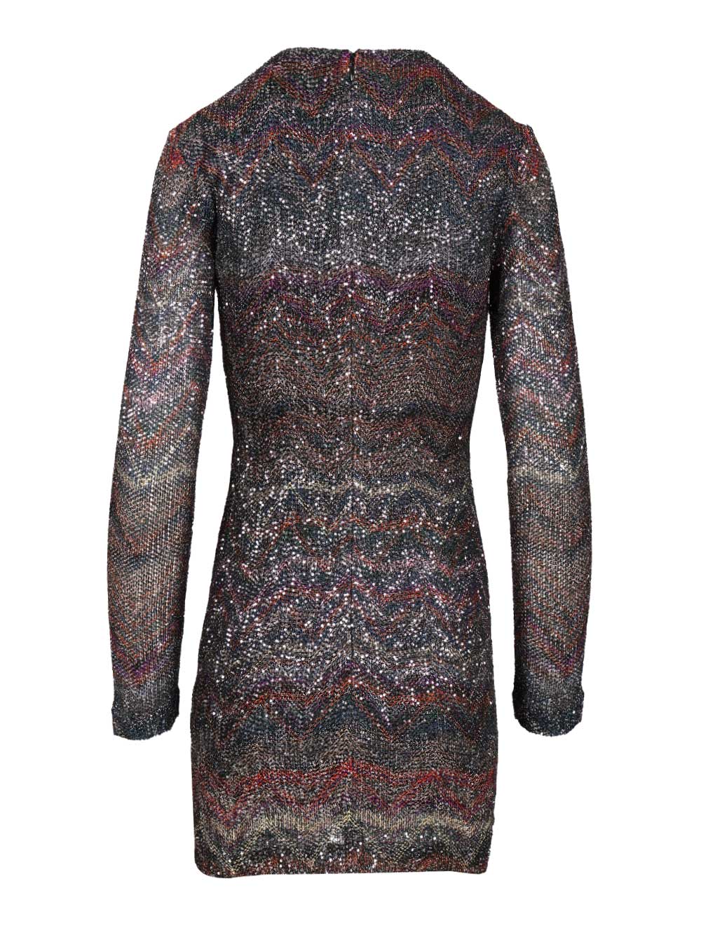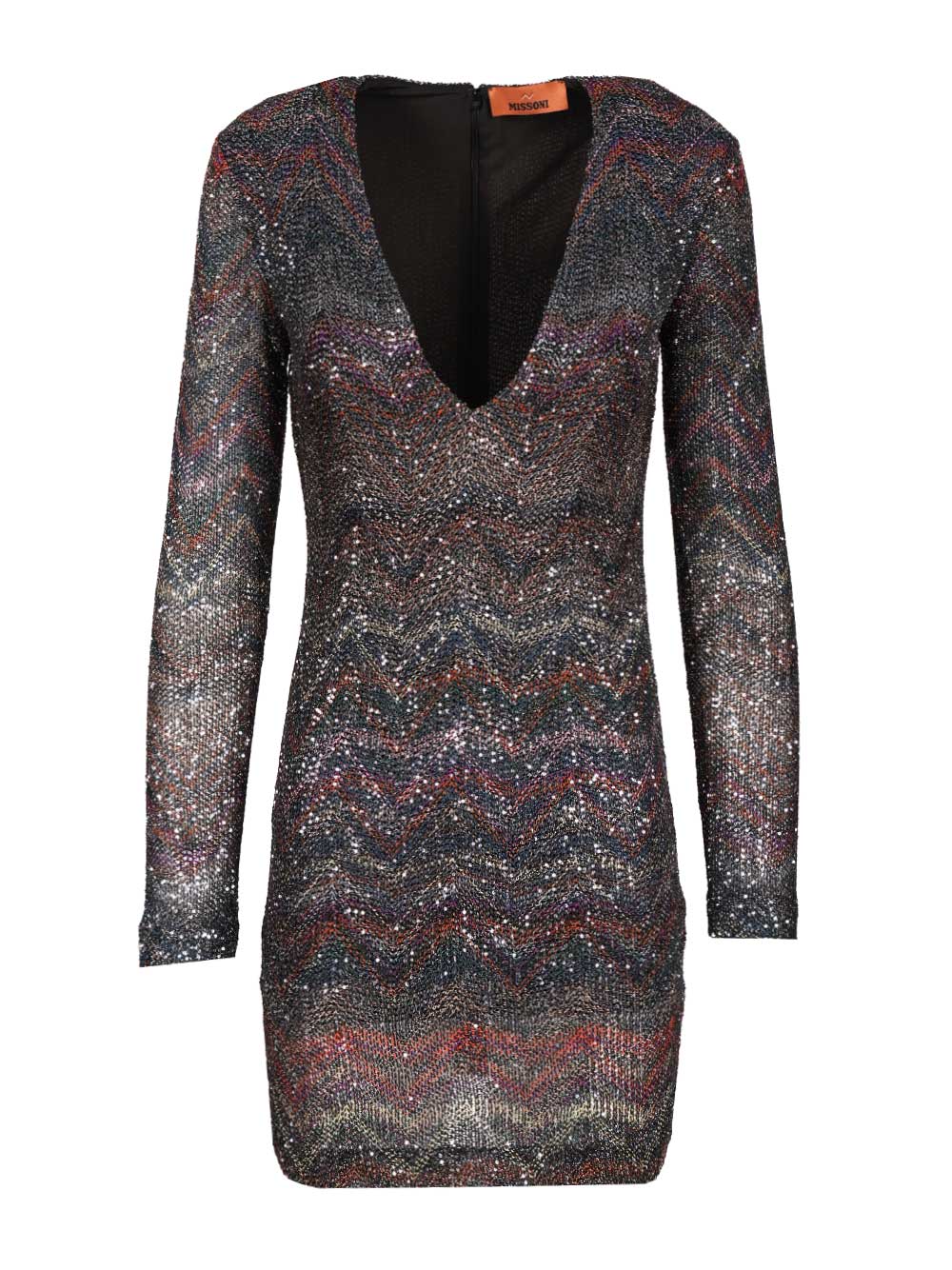 V-neck mini dress with zigzag motif and long sleeves. Made on the Capardoni loom, it has a zip closure on the back.