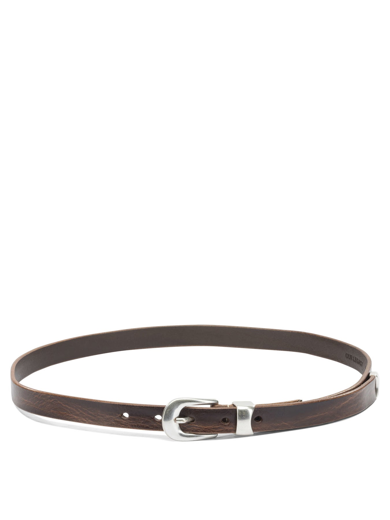 Our Legacy leather belt, made of carefully selected calfskin leather, with straight construction and slim 2-cm wide silhouette. Features a metal buckle buckle, matching single loop, and attached metal tip. Belt length includes buckle and corresponds to 80 cm, 90 cm or 100 cm from end to center hole slot. Visible integrated metal elements. || - Selected calfskin leather - Metal buckle closure - Metal toe - Single metal loop