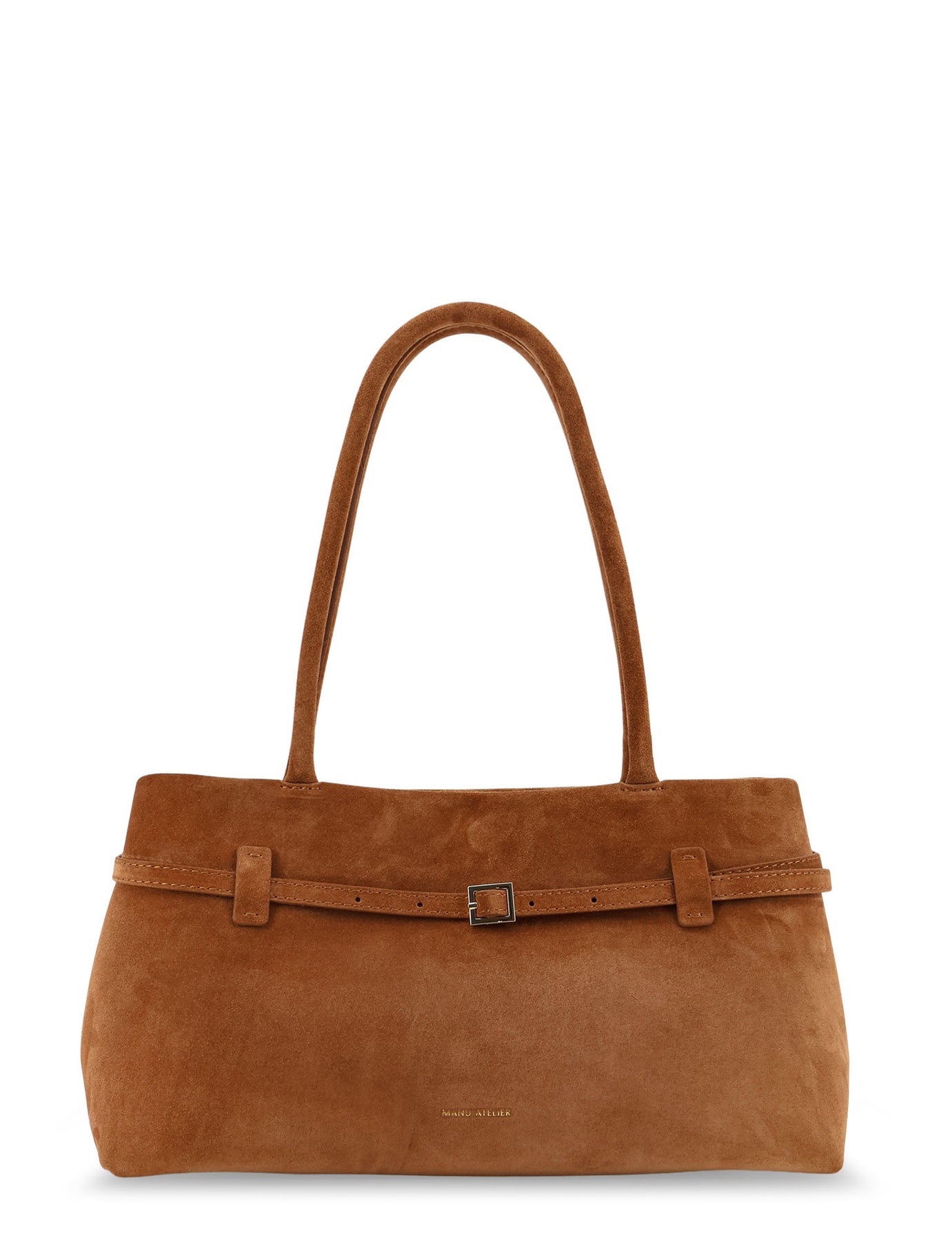 Button closure Metal buckle strap on the front Two suede handles Single compartment and one internal zip pocket Suede Lining: suede W: 34cm H: 19.5cm x D: 18.5cm SKU: 2025261CAMEL