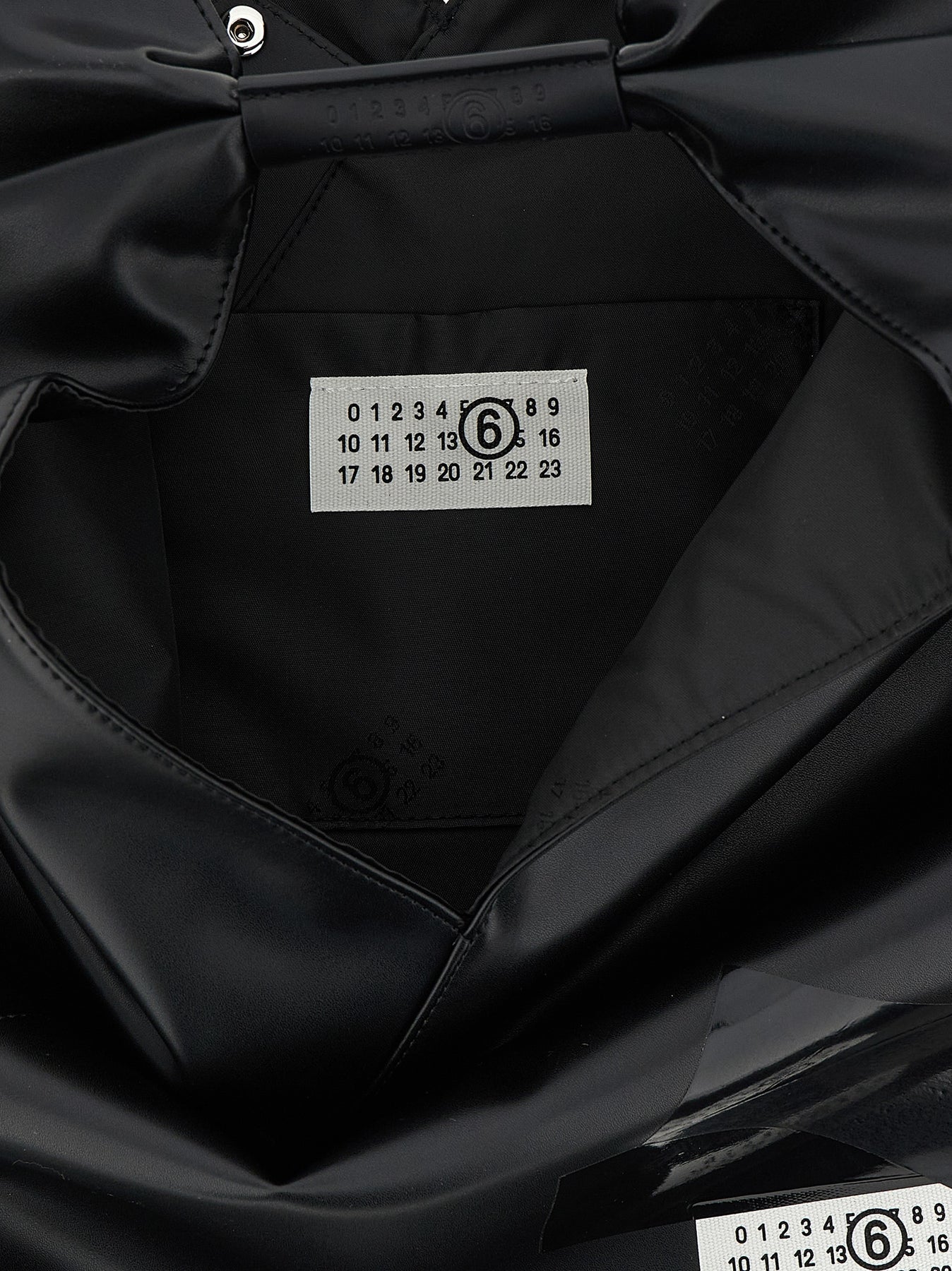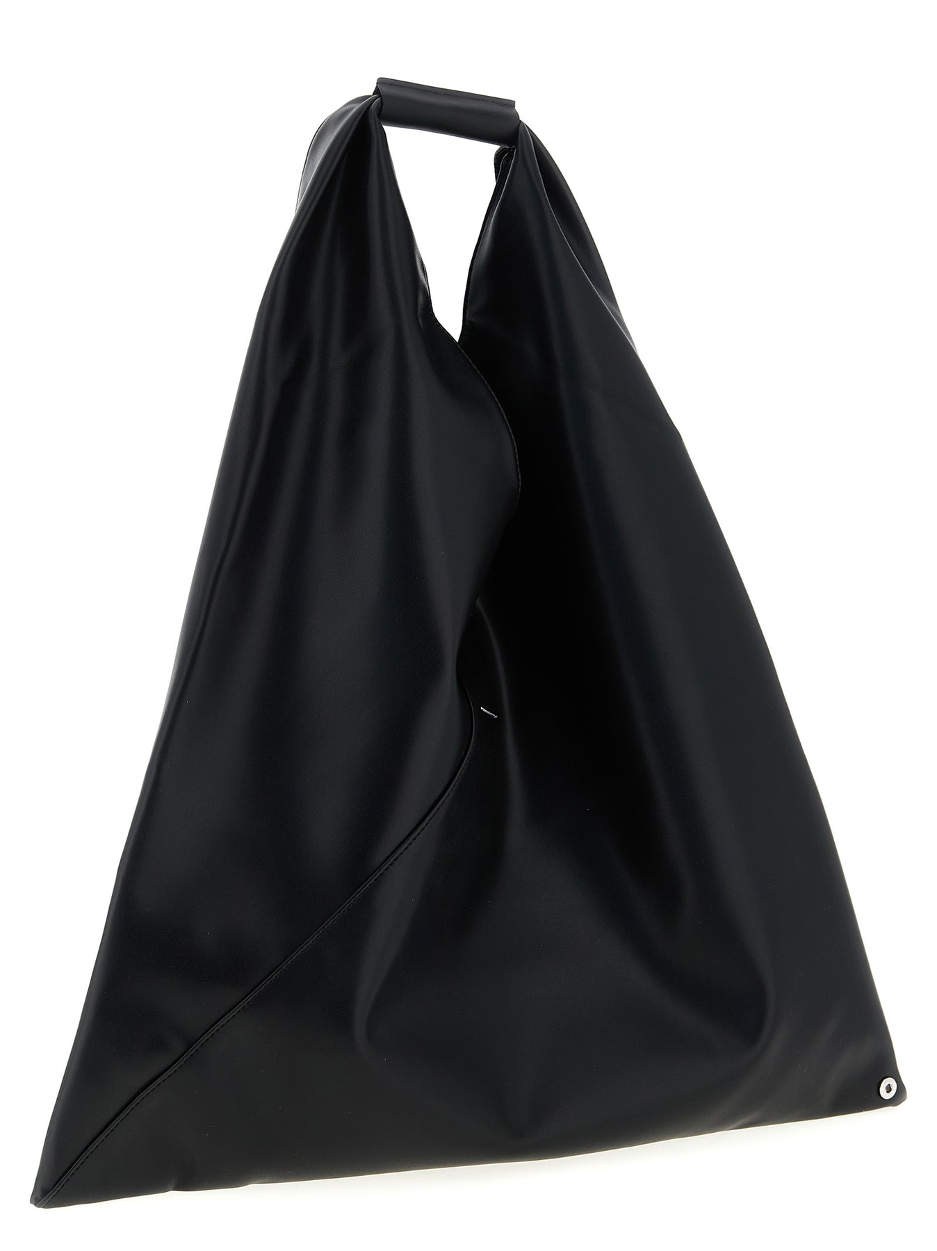 'Japanese Classic' handbag in leather-effect fabric with triangle silhouette, front detail with packing tape covering the 'Numeric signature MM6' label, fixed handle with embossed 'Numeric signature MM6', ' White stitch line the rear. The buttons at the edges allow you to change the shape of the bag by folding it in different ways.
