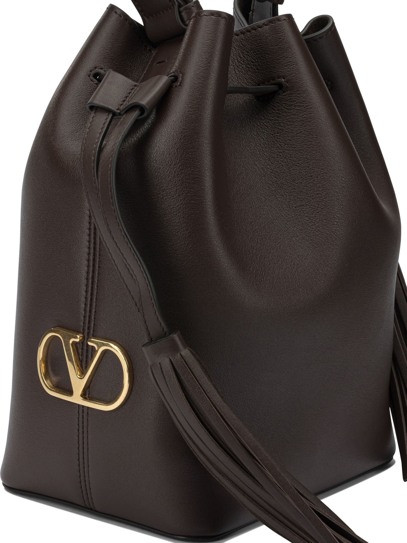 Valentino Garavani "So Seau" shoulder bag made of calfskin leather with soft texture and adjustable top handle. The rounded silhouette is defined by a drawstring closure finished with side tassels and an applied gold metal Vlogo detail on the side. The interior is suede-lined, with curated interior trim and visible contrast stitching. || - Calfskin leather - Adjustable top handle - Drawstring closure - Side tassels applied to the drawstring - Gold metal side Vlogo detail - Suede-lined interior - Interior trim with exposed stitching
